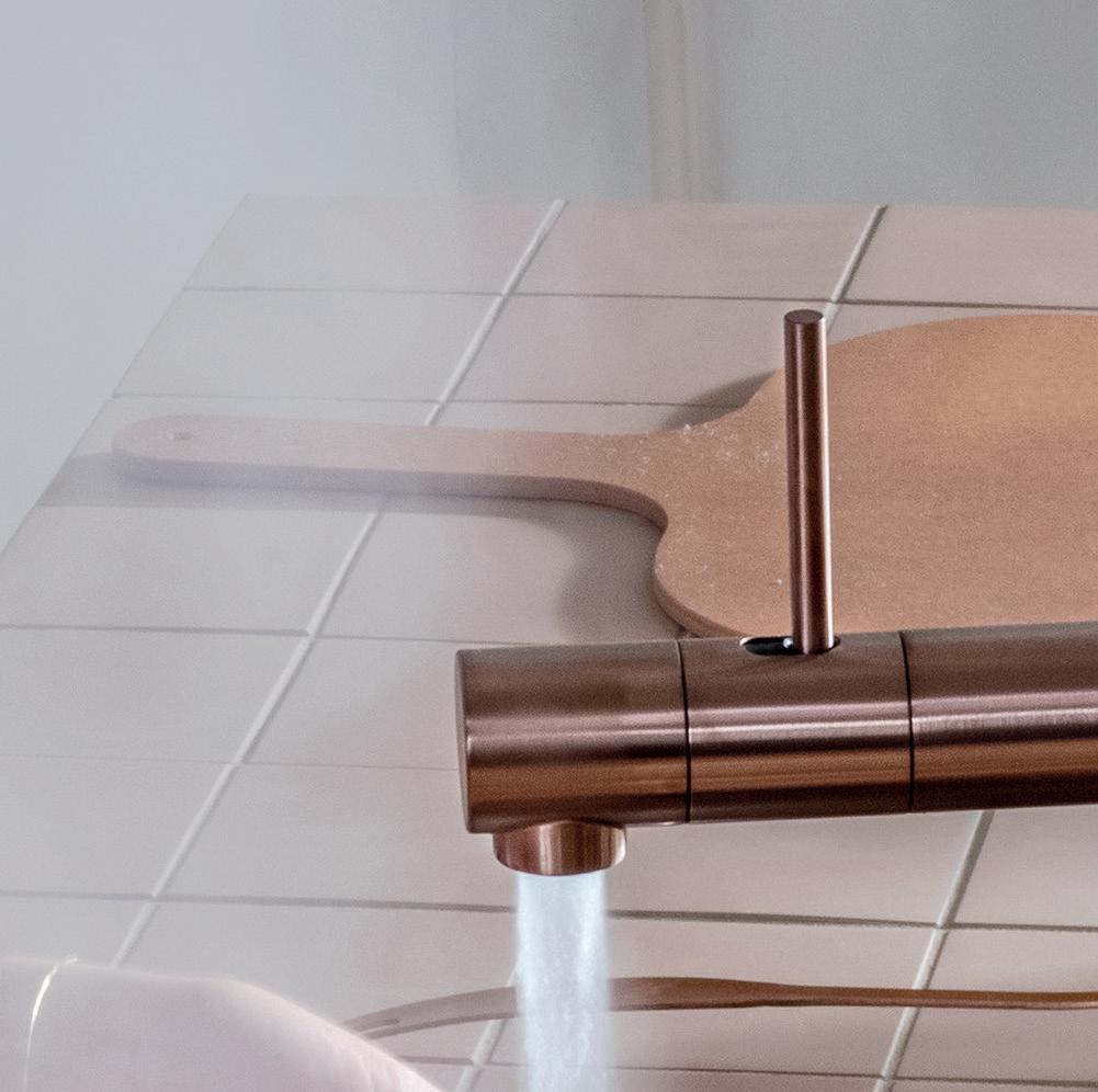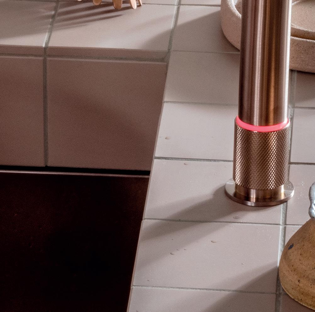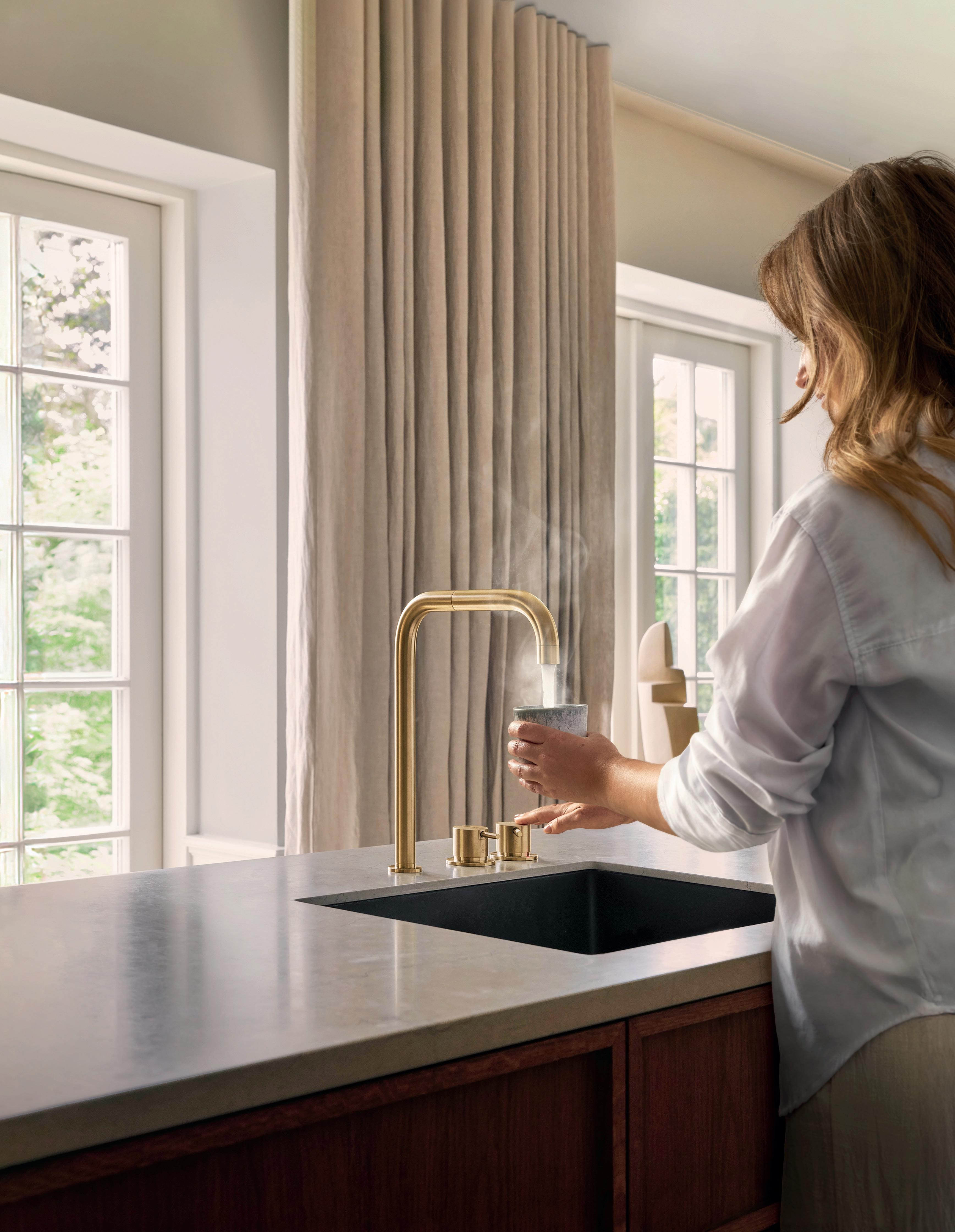 Fem funktioner i ét køkkenarmatur: Kogende vand, filtreret vand, isvand, isvand med brus og normal kold/varm blanderfunktion. Tidløst dansk design. KV5 i børstet guld fra Exclusive Colour serien.