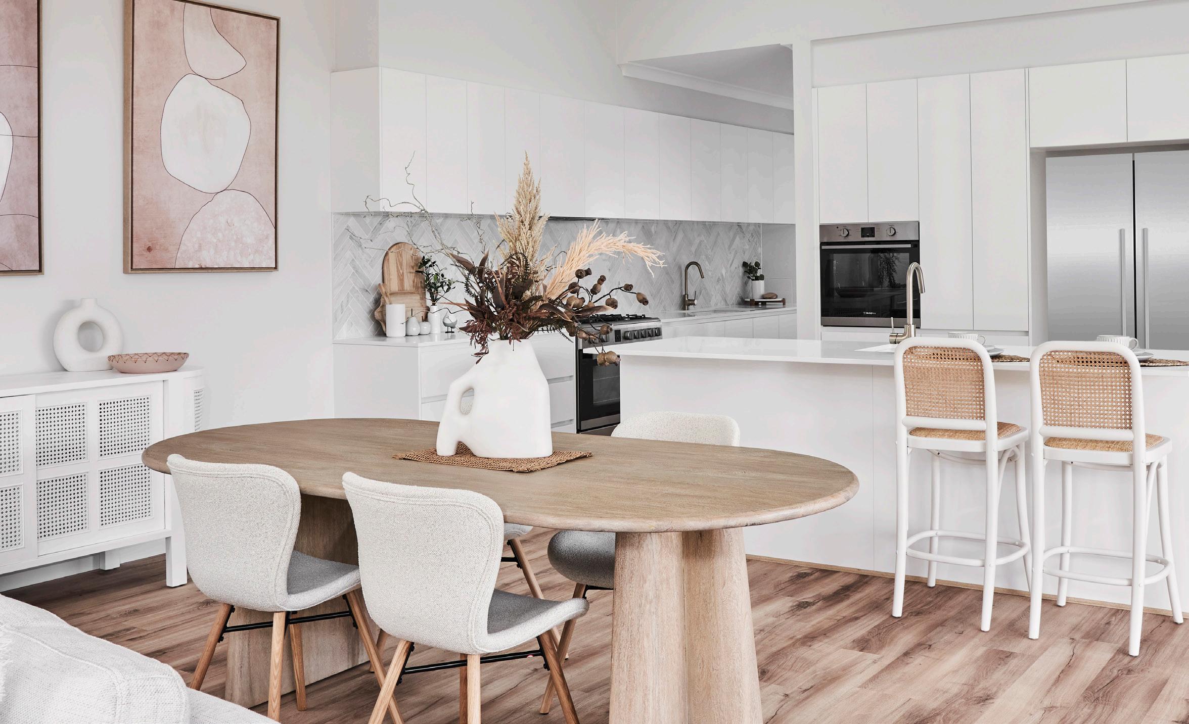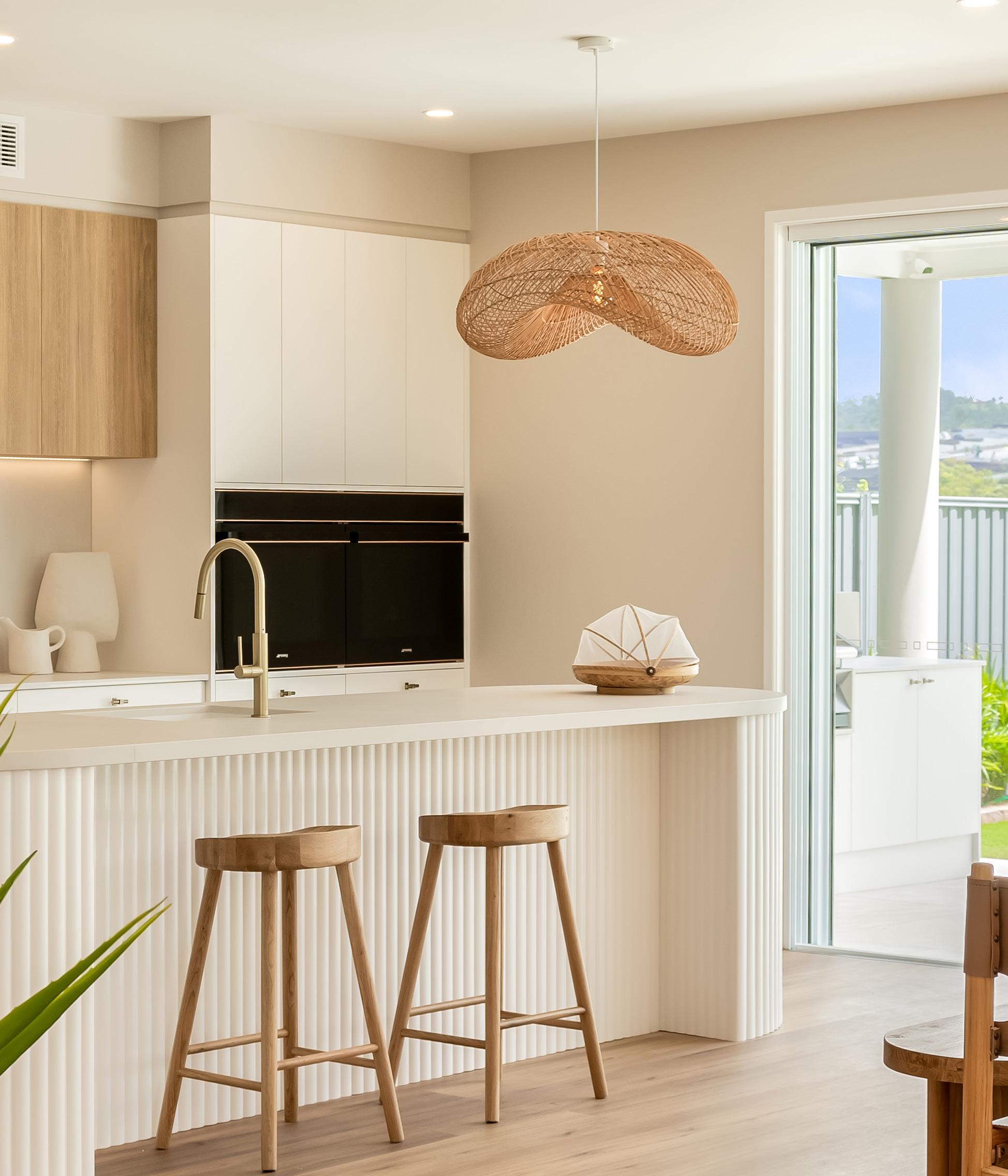 Incorporate tactile elements like woven cane, boucle fabrics, and dried botanicals to add depth. Include polished details, such as chevron tiling and sleek appliances, to ensure a clean, contemporary finish that feels both serene and inviting.