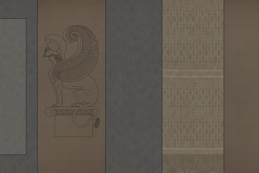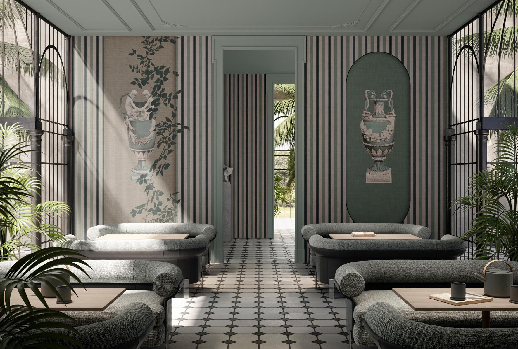 The wallcovering’s aesthetics are a contemporary take on neoclassicism, with a skilful interplay of scenery that reveals sharp strokes defining the figures and the details of pilasters and capitals evoking the sinopias of the grand wall frescoes of the past.
