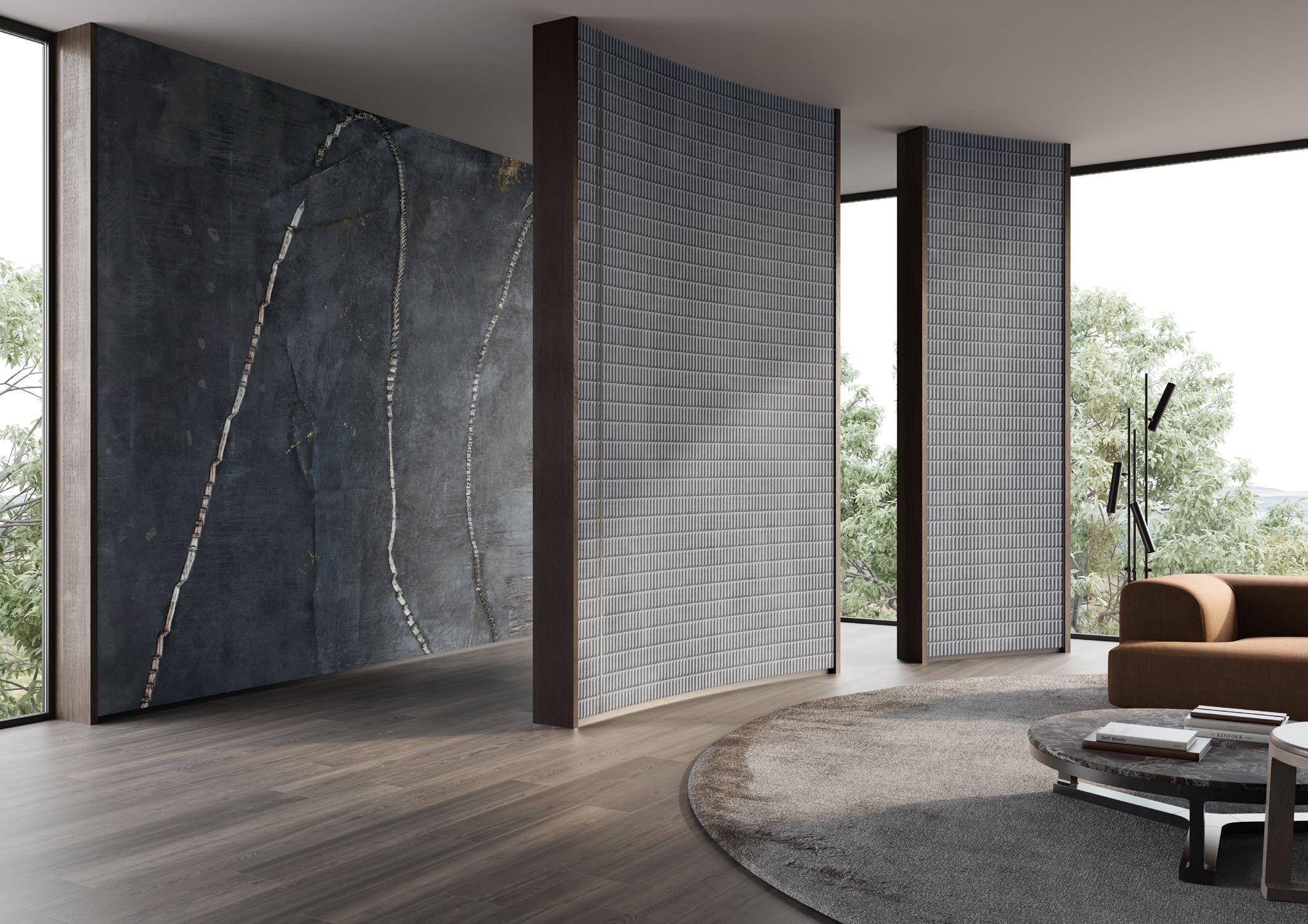 A journey to other worlds. Sophisticated combinations of materials, colours, and patterns come together to create contemporary frescoes.