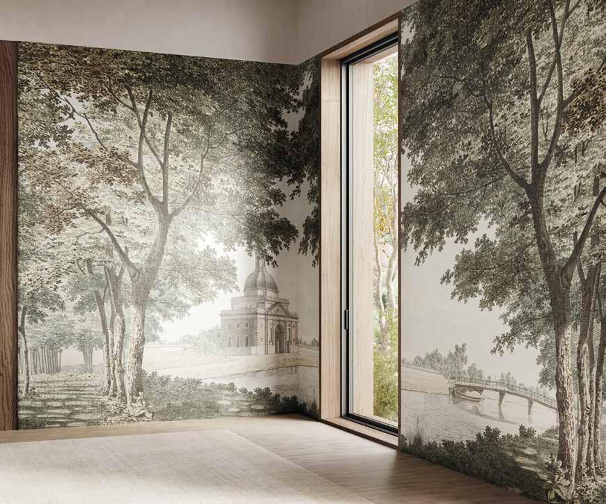 Sono spazi immensi o remote oasi di pace, spesso punteggiati da canali d’acqua, fontane, rocce e laghetti; gioielli che regalano felicità e benessere a patto di immergervisi anima e corpo, respirandone ogni profumo e assorbendone ogni vibrazione. I soggetti di questo tema di collezione nascono con l’intento di portare negli interni le fragranze e le sfumature di mondi profondamente reali, che però hanno la dimensione di un sogno. Autentiche porzioni di paesaggio in cui un linguaggio decorativo poetico ed emozionale, fatto di tratti decisi e colori sapientemente calibrati, restituisce un’esperienza densa di suggestioni.