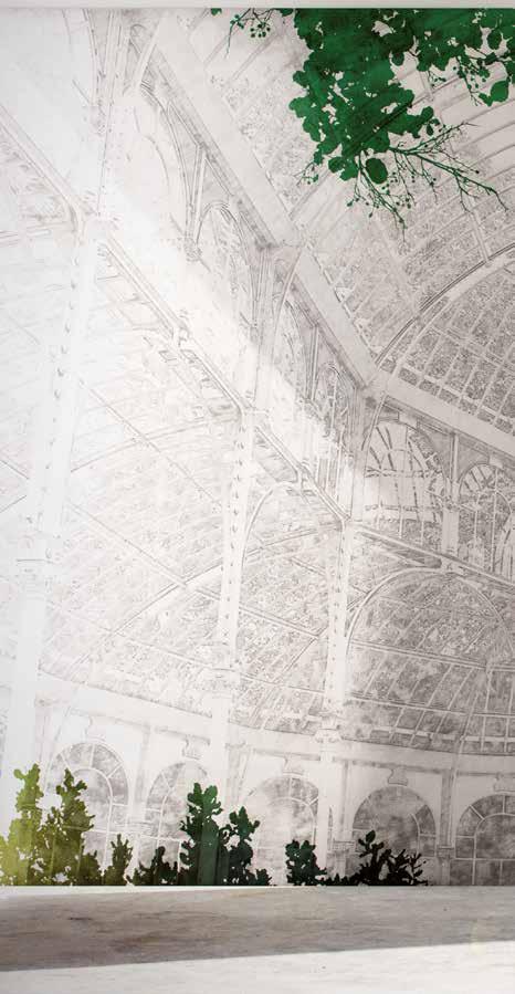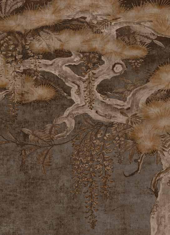 The wallcovering is made up of a viscose fabric and has a mineral powder finish. With its exquisite iridescent embossing, it reflects light so every element portrayed takes shape in an extremely natural and visually expressive way.