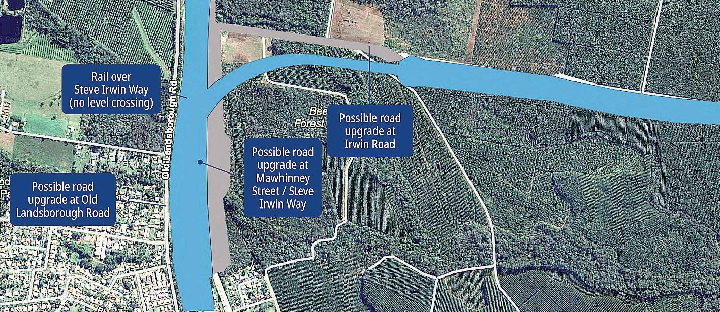 The new ‘Corridor Alignment’ maps show the track cutting east near Newells Rd. An overpass across Steve Irwin Way will keep traffic moving once the project is finished by 2032. Maps, story p4-5