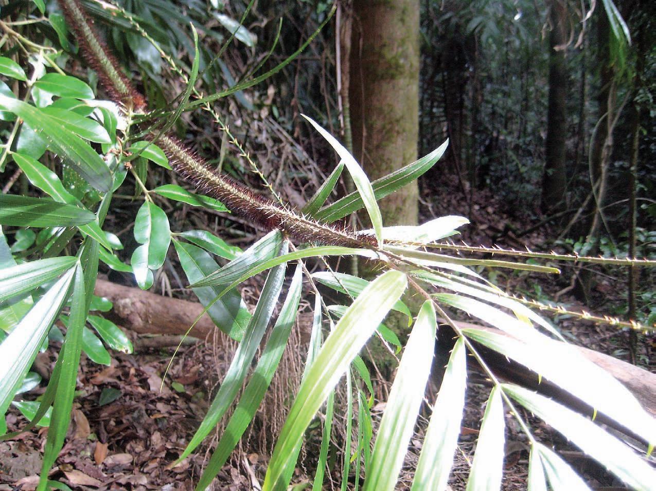 One of the most notable vines is Calamus muelleri, known as Jini or Lawyer Cane. This plant is infamous for its hooked stems that latch onto passers-by, inspiring its common name. More significantly, it is called Jini by the Jinibara People, who are known as the People of the Calamus. For them, this vine serves as an essential material for weaving baskets, traps and other items.