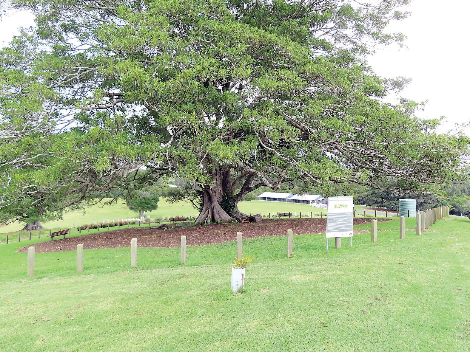 The fig has long been a central feature of the Precinct, which includes seating, logs, and a landscaped setting used for community gatherings and special events.