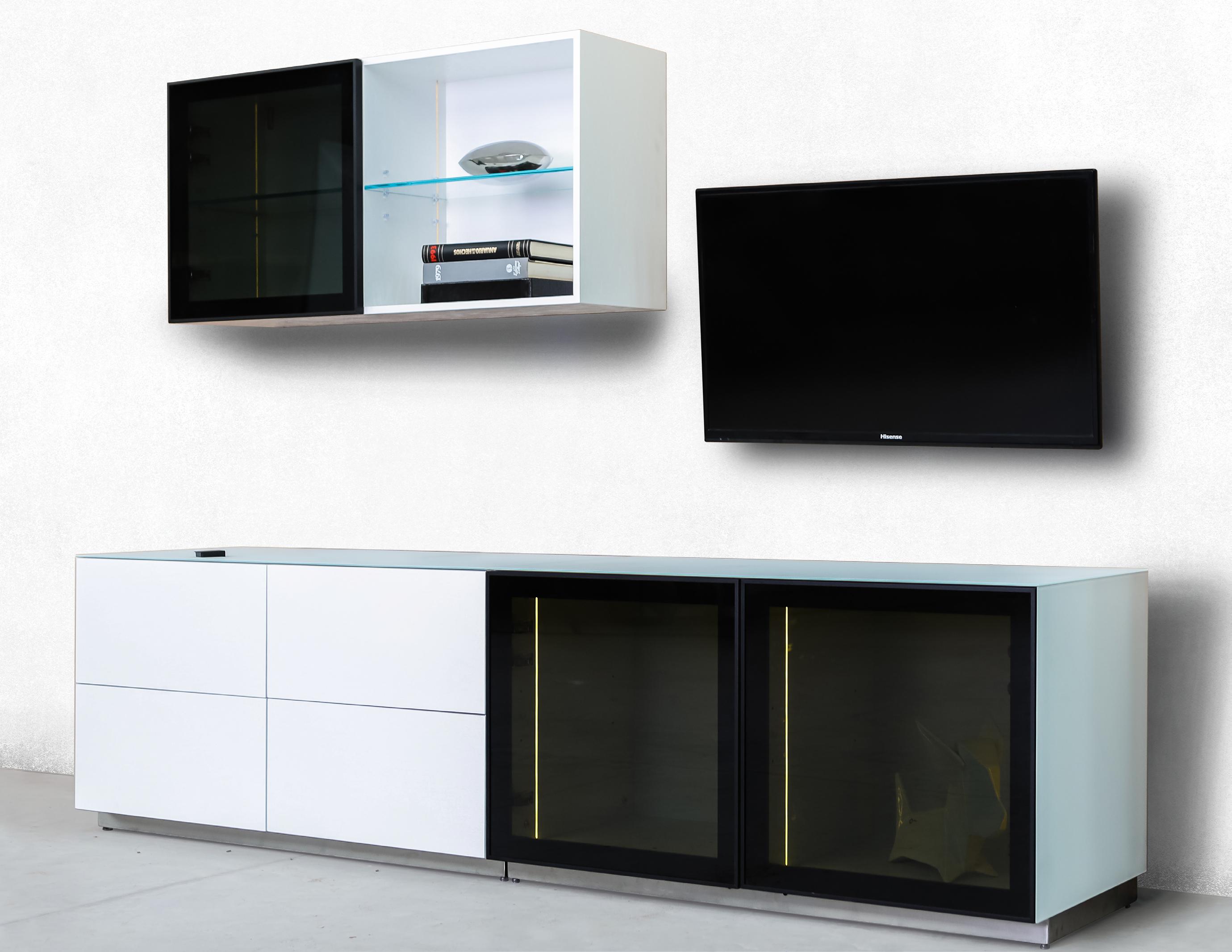 - Custom & extras: Smoke Glass Doors with Aluminum Frame / LED Lighting System / 2” Plinth Base / Glass Shelf / External Drawers / Wall Hanging System