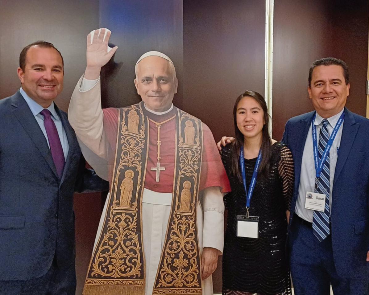 BELOW: Three members of our communications team pose with a cardboard Pope Leo at the Catholic Media Awards night.