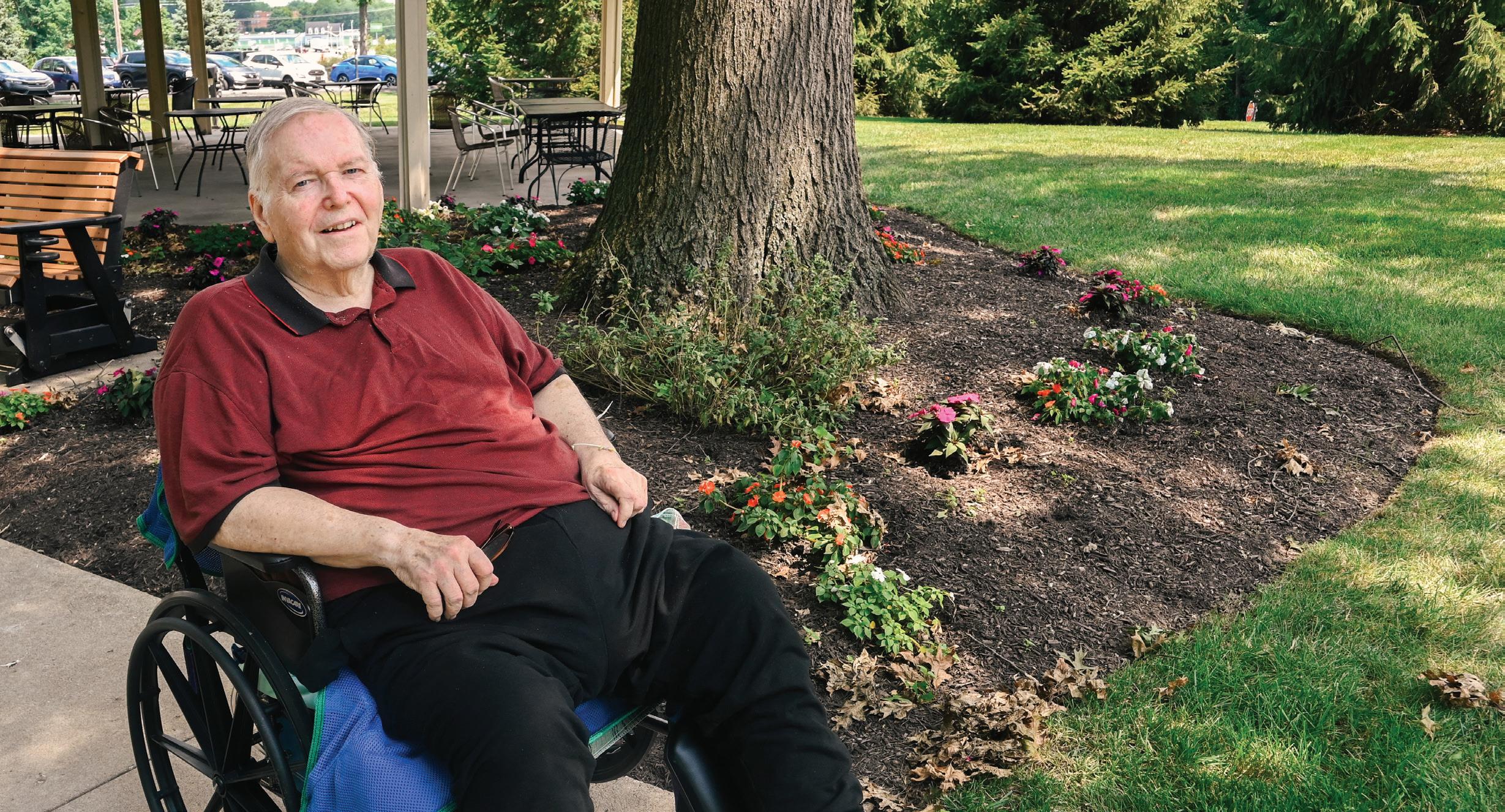 Father Vic occasionally strolls in his wheelchair through the gardens of the nursing home.