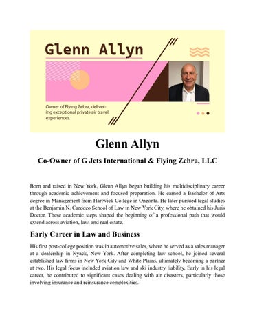 Glenn Allyn, a native New Yorker, has built a diverse and accomplished career across aviation, law, and real estate. He earned a Bachelor of Arts in Management from Hartwick College in Oneonta and a Juris Doctor from the Benjamin N. Cardozo School of Law in New York City. These academic foundations prepared him for leadership roles in highly regulated and operationally demanding fields. He began his career in business as a sales manager at a car dealership in Nyack, New York. After completing law school, he joined several respected law firms in New York City and White Plains, ultimately becoming a partner at two. His legal work focused on aviation law and ski area liability, and he was involved in complex cases related to airline accidents and reinsurance matters. During this time, he coached competitive youth ski teams, helping athletes develop racing techniques and safety awareness. He mentored students and instructors as a J3/J4 coach and ski resort trainer. Glenn B Allyn spent over 15 years in real estate as a builder, developer, and property manager for residential and commercial properties. He oversaw construction projects, managed tenants, handled leasing, and maintained properties. This experience added depth to his operational skills and business management capabilities. His aviation career began as a Learjet captain for Northeast Jet in Pennsylvania. He later became Director of Operations for Tab Aviation and worked as a broker with Best Jets, Inc., handling aircraft transactions involving jets, turboprops, helicopters, and seaplanes. He also served as Chief Pilot at M’Air Aviation before founding Flying Zebra, a private air charter company based at Westchester County Airport. Flying Zebra operates Pilatus PC-12 aircraft and offers flights across the U.S., Canada, the Bahamas, and the Caribbean.
