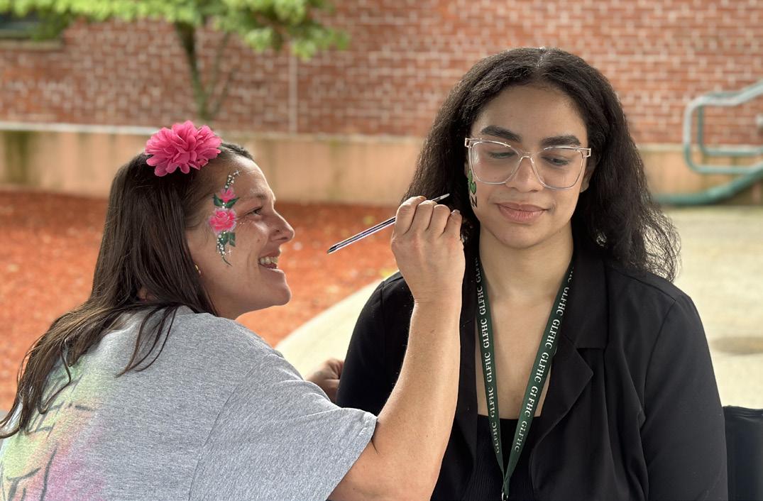 Clockwise from top left, an artist from “The Party Fun” paints the face of Site Nurse Manager Alexandra Perez; educating the public on substance use disorders are Community Health Workers, from left, Brianna Candelario, Ben Gonzalez and Ilia Castellanos; and, from left, Central Admin. Coordinator Nora Ortiz and Development Associate Sonja Then greet fairgoers.