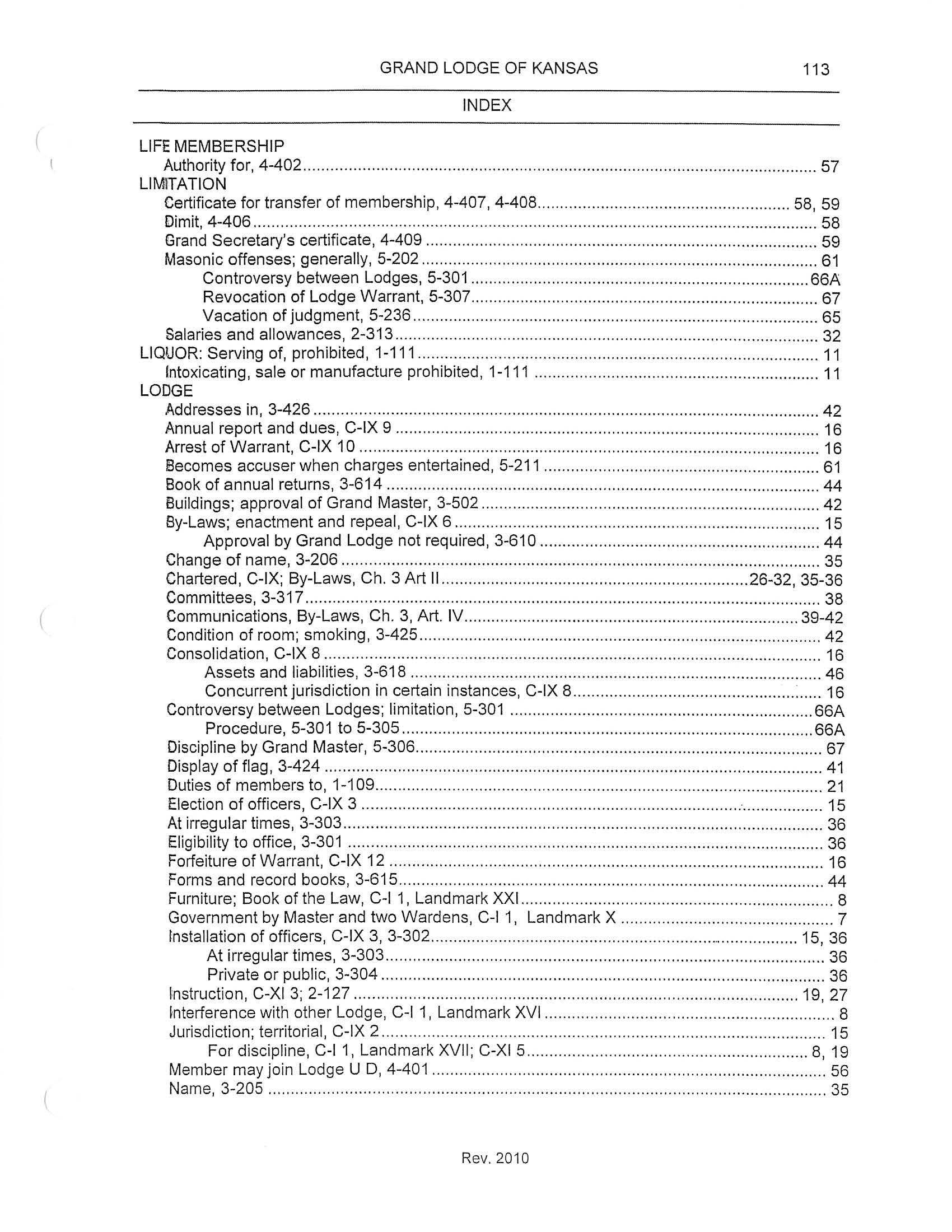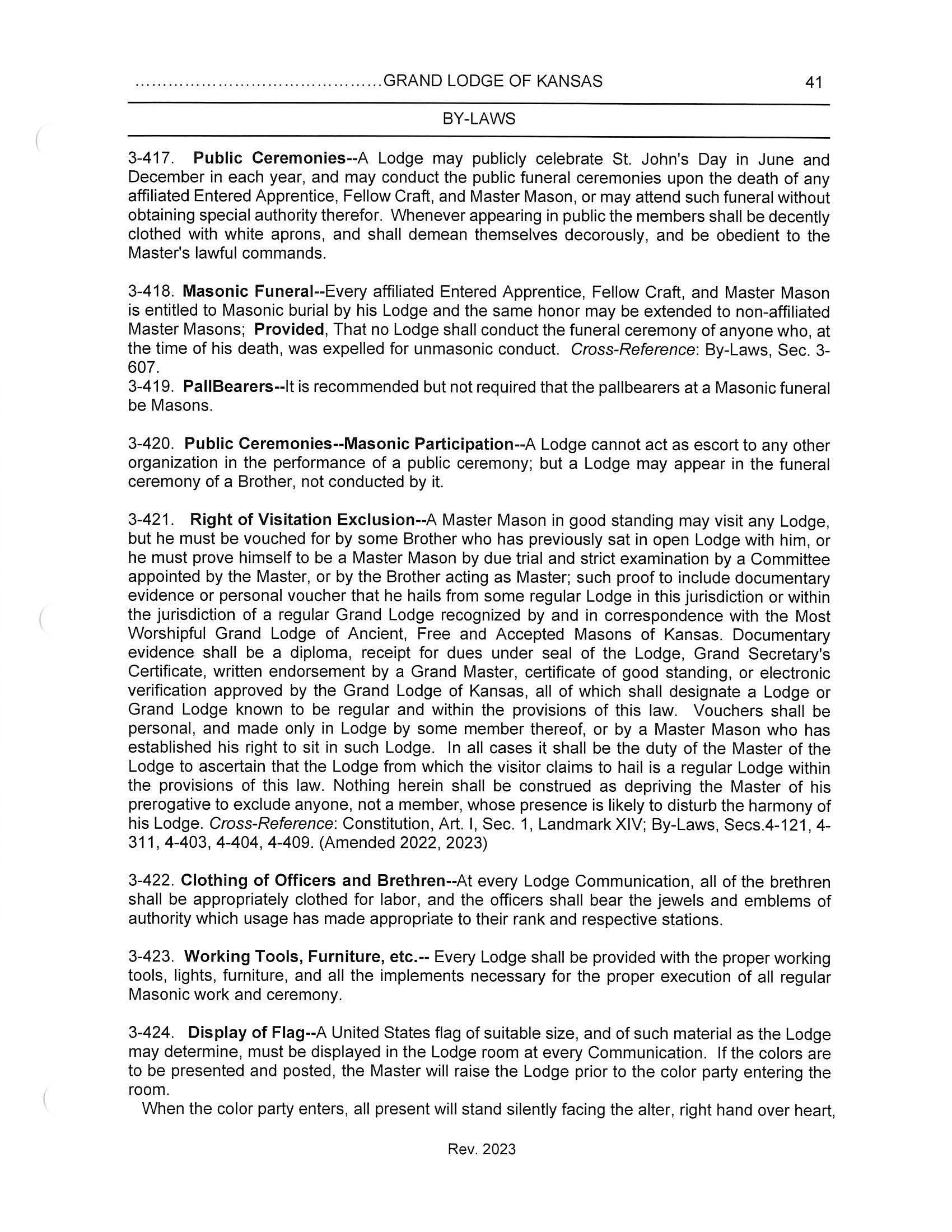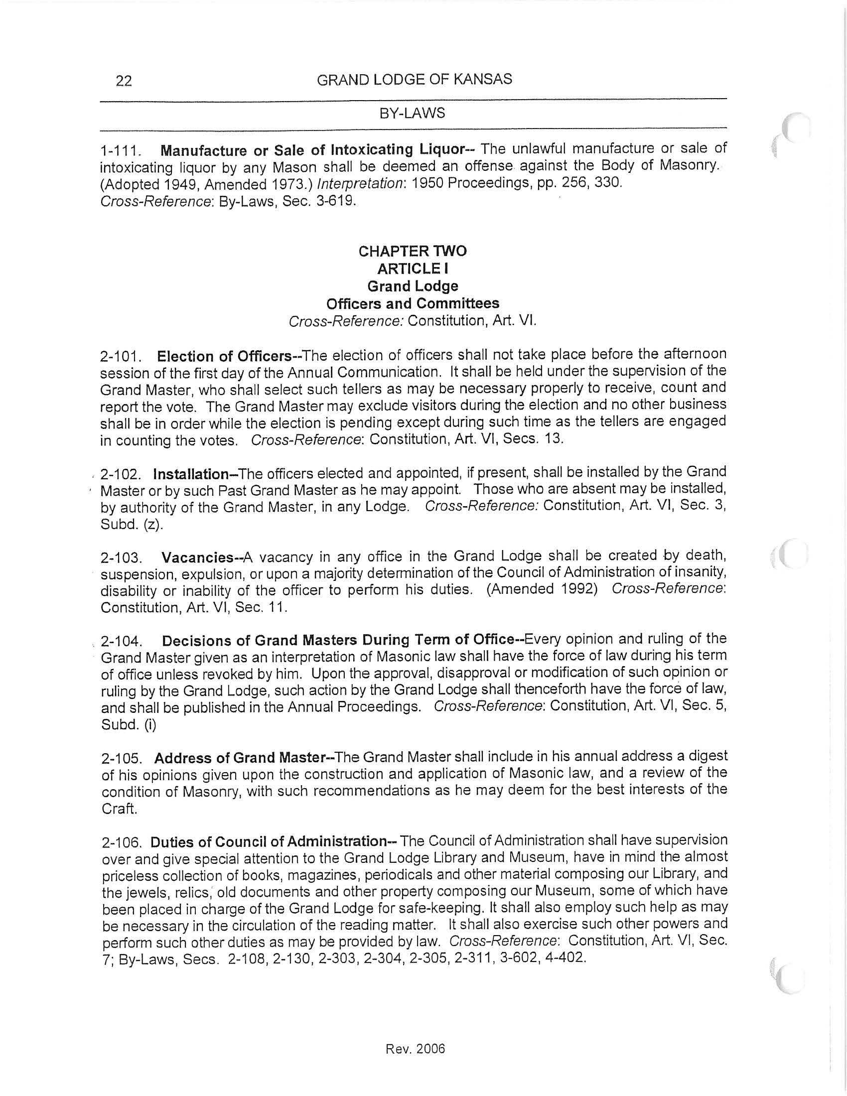 The revision of the By-Laws also involved a complete rearrangement, and division into chap ters , articles and sections. With the consent of Brother C. D. YETTER, who was compiler of the Re vised Statutes of Kansas in 1923, and who originated the numbering system used in that and subsequent editions, a similar system has been used in numbering the re vised By-Laws. Each number is a complete designation of chapter, article and section. To illustrate , the number 3-421 des ig na tes Section 21 of Article 4 of Chapter 3. This system also affords opportunity to enact additional sections in any article without disturbing the continuity.
