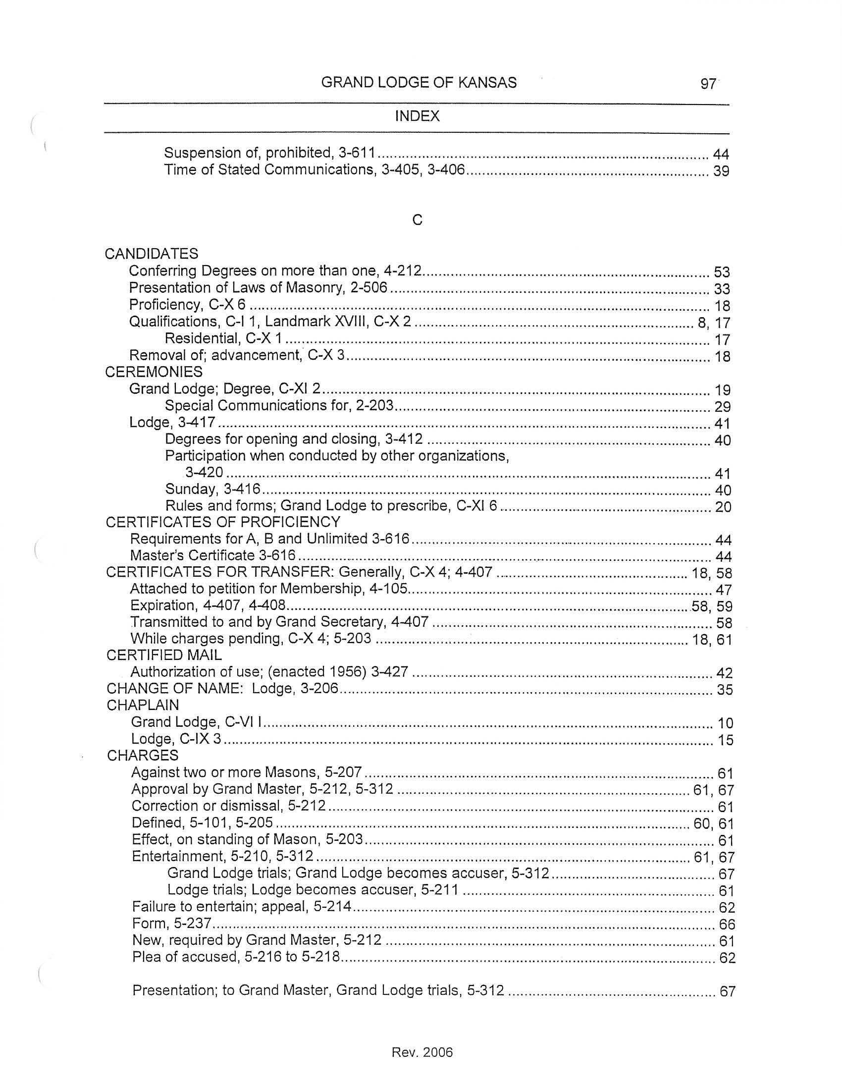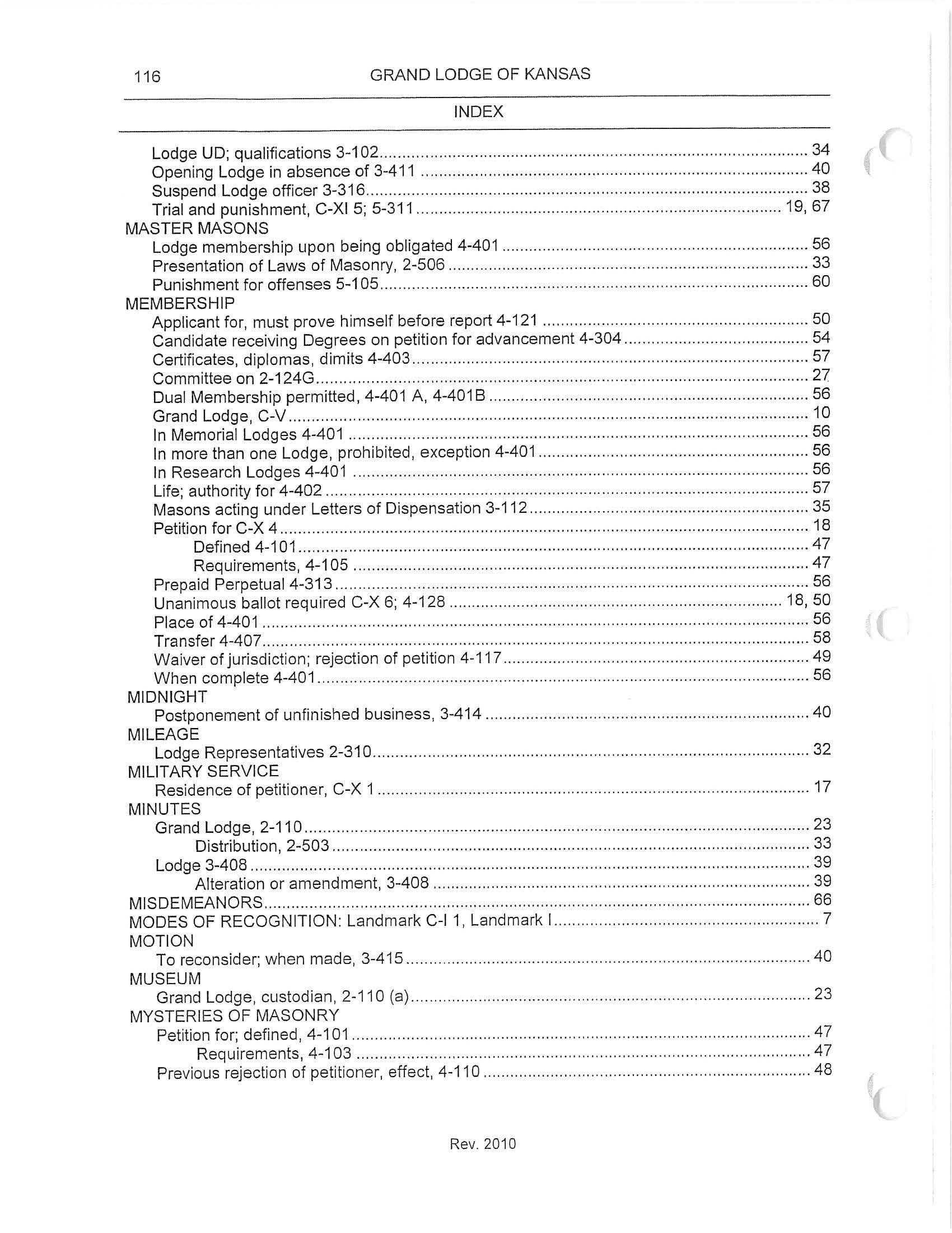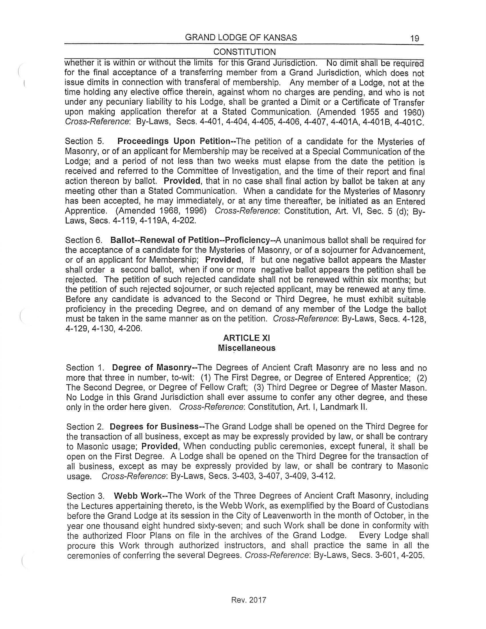 The revision of the By-Laws also involved a complete rearrangement, and division into chap ters , articles and sections. With the consent of Brother C. D. YETTER, who was compiler of the Re vised Statutes of Kansas in 1923, and who originated the numbering system used in that and subsequent editions, a similar system has been used in numbering the re vised By-Laws. Each number is a complete designation of chapter, article and section. To illustrate , the number 3-421 des ig na tes Section 21 of Article 4 of Chapter 3. This system also affords opportunity to enact additional sections in any article without disturbing the continuity.