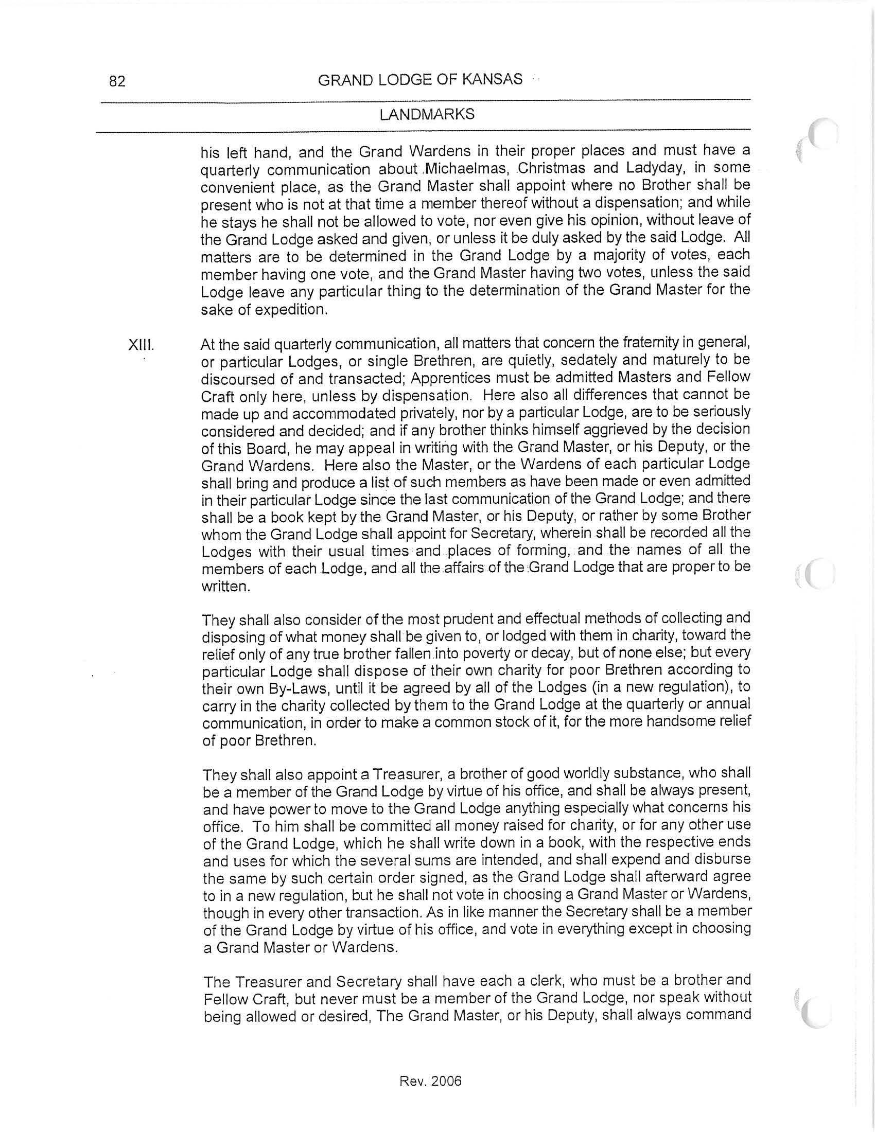 At the said quarterly communication, all matters that concern the fraternity in general, or particular Lodges, or single Brethren, are quietly, sedately and mature ly to be discoursed of and transacted; Apprentices must be admitted Masters and Fellow Craft only here, unless by dispensation. Here also all differences that cannot be made up and accommodated privately, nor by a particular Lodge, are to be seriously considered and decided ; and if any brother thinks himself aggrieved by the decis ion of this Board , he may appeal in writing with the Grand Master, or his Deputy, or the Grand Wardens Here also the Master, or the Wardens of each particular Lodge shall bring and produce a list of such members as have been made or even admitted in their particular Lodge since the last communication of the Grand Lodge; and there shall be a book kep t by the Grand Master, or his Deputy, or rather by some Brother whom the Grand Lodge shall appoint for Secretary, wherein shall be recorded all the Lodges w ith their usual times ·and places o f form ing, and the names of all the members of each Lodge, and all the affairs of the Grand Lodge that are proper to be written.