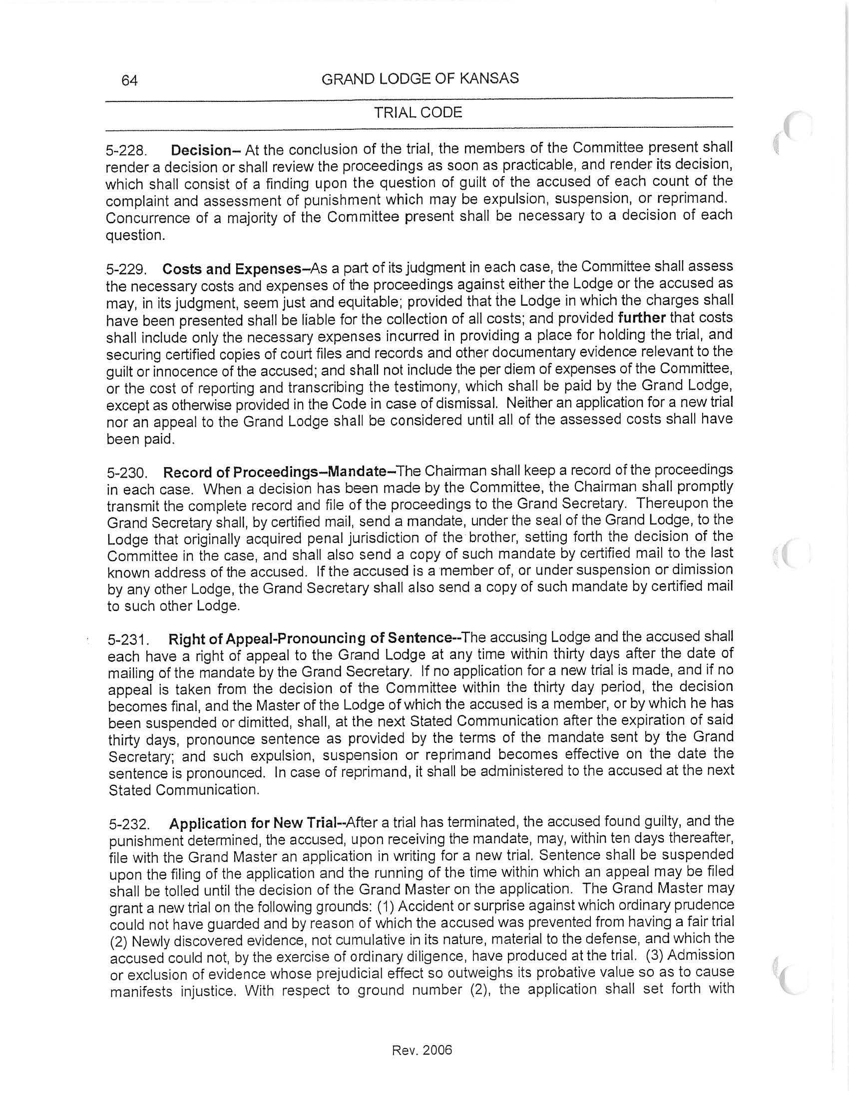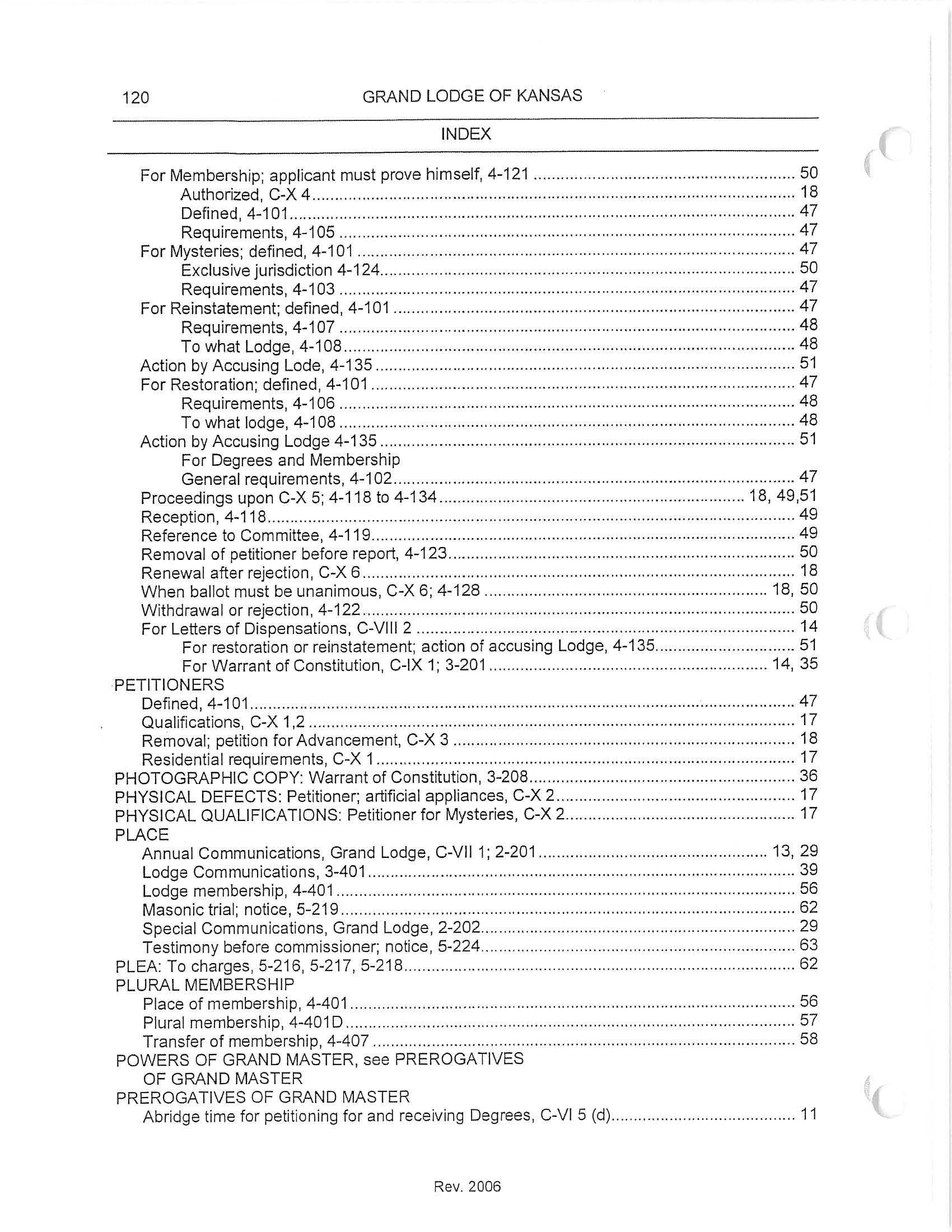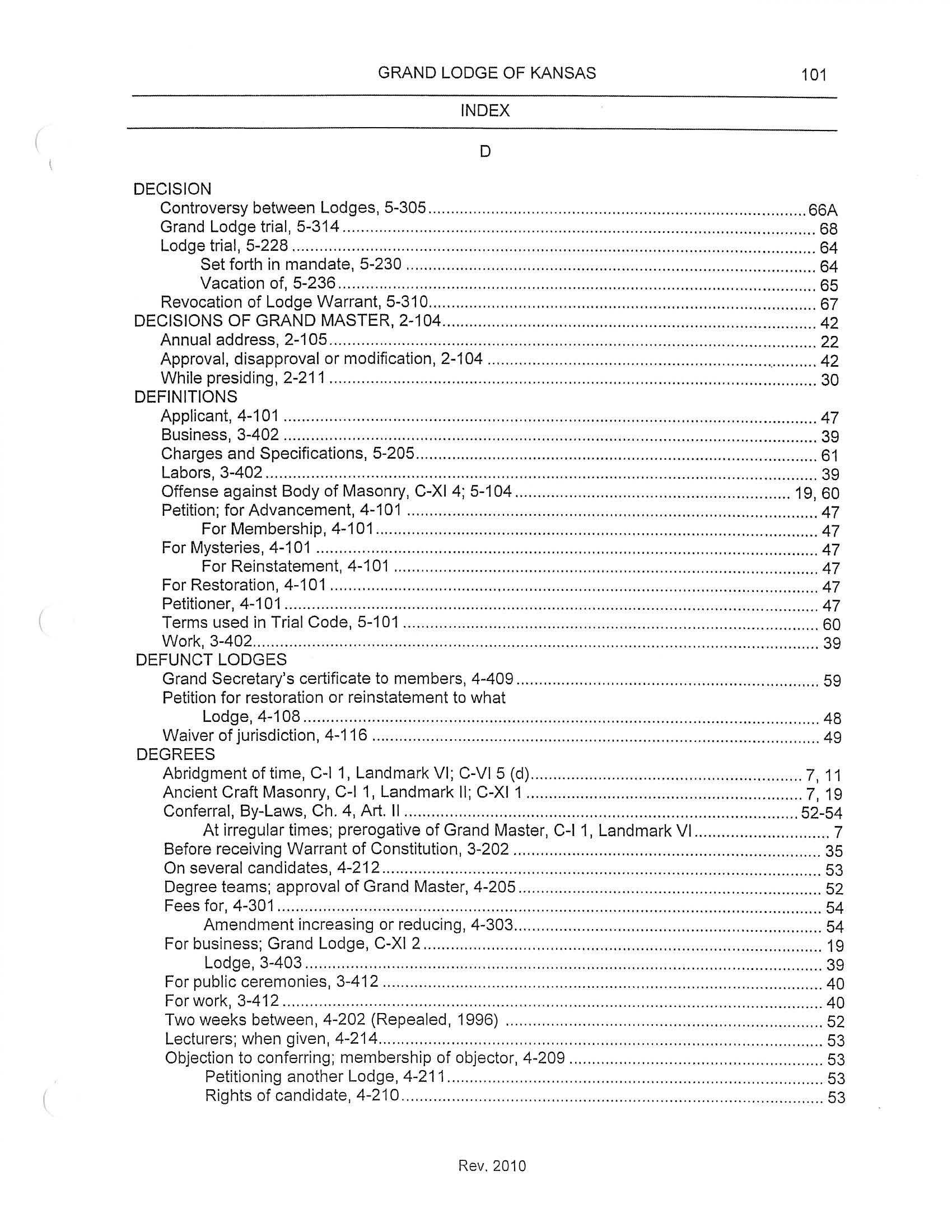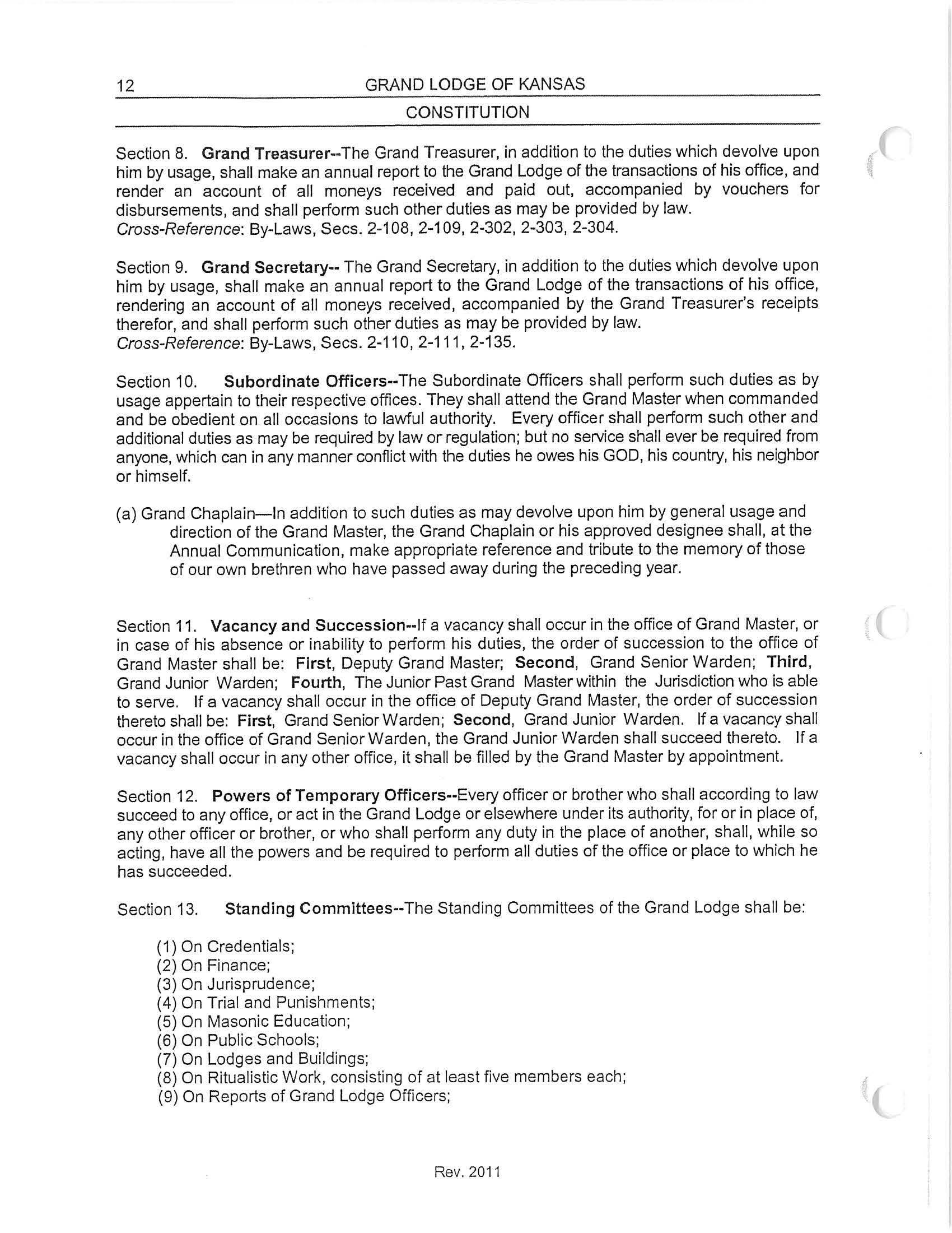 Each Kansas Mason may provide himself with a copy of the current Laws of Masonry in this jurisdiction by purchase from the Secretary of his Lodge or by sending .80 to the Grand Secretary The provisions of By-Law 2-506 require that each newly raised Master Mason shall be presented with a copy of the Laws of Masonry on the night that he is raised. For the purpose of assisting each Lodge to maintain a revolving supply of books, the Grand Secretary wil l send to each Lodge as soon as possib le after each Communication of Grand Lodge, a number of books equal to the number shown to have been raised in that Lodge during the previous yea r, and reported on the Annual Report of the Lodge. Additional copies may be secured from the Grand Secretary at .80 per copy (Amended 1979)