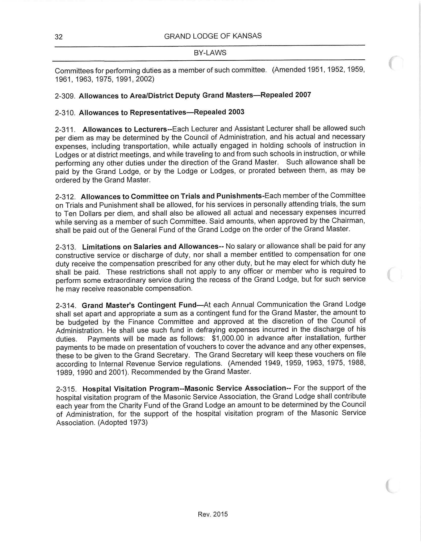 "Last year, with the permission of M :. W :. Nolan Artz , then Grand Master, I appointed th is committee, chai red by M .-. W :. Robert D. Caplinger, to update and clarif y the word ing of some of our By-Laws."