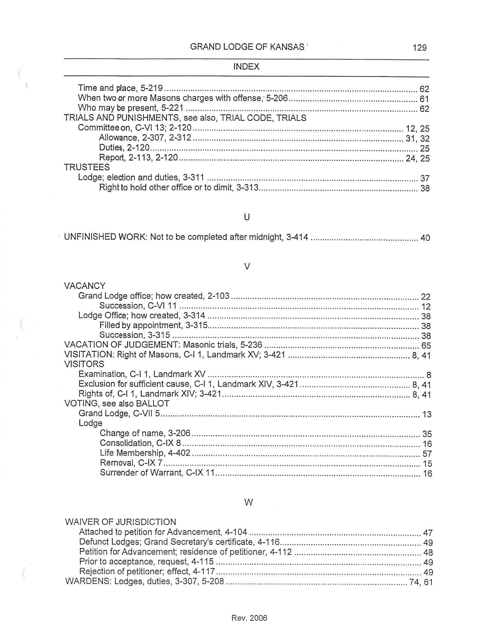 The Grand Lodge , in February 1942, authorized the appointment of a Committee on Revision of Laws. As the result of action at subsequent Communications, appointments were made annually thereafter until the completion of the revision work at the Annual Communication in February 1946. Changes in personnel of the Committee were made from time to time, and the following brethren have served: ROSCOE E. PETERSON, 1942-45 inclusive; ARTHUR H. STRICKLAND, 1942-45 inclusive; GEORGE F. BEEZLEY, 1942, JAY 8 KIRK, 1942-43; OTTO R SOUDERS , 1942-43; ELMER F. STRAIN, 1943-44; HENRY S. BUZICK, JR., 1944-45 ; GEO. M ASHFORD , 1944-45 ; JAMES H. TRICE, 1945.