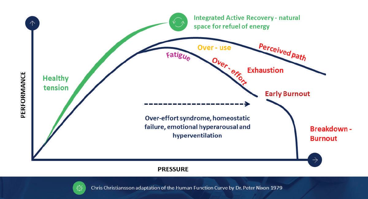 Thisinnovativeprogramwasdesignedto improvehealthandperformancein demandingworkenvironments.Chris explainsthathisapproach,usingthe“human functioncurvemodel”,waswell-received byleaders,asitillustratedtheprogression fromhealthyperformanceto“over-use–fatigueandunhealthyperformance.”