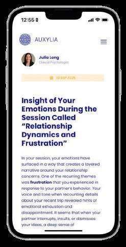 HowAuxyliaWorks Auxyliafollowsasimpleidea.Itsupportsreal therapyinsteadoftryingtoreplaceit.The platformusesahybridmodelthatconnects onlinesessionswithahumanpractitionerand AI-generatedinsightsthatcontinuethework betweenappointments.Aftereachtherapy session,thepatientreceivesonedetailed insightofabout450words.Thisreflection highlightskeythemesfromtheconversation andgentlyencouragesthepatienttothink moredeeplyaboutwhatwasdiscussed.Many patientsdescribethisstepasawaytokeep thesessionalivelongafteritends.