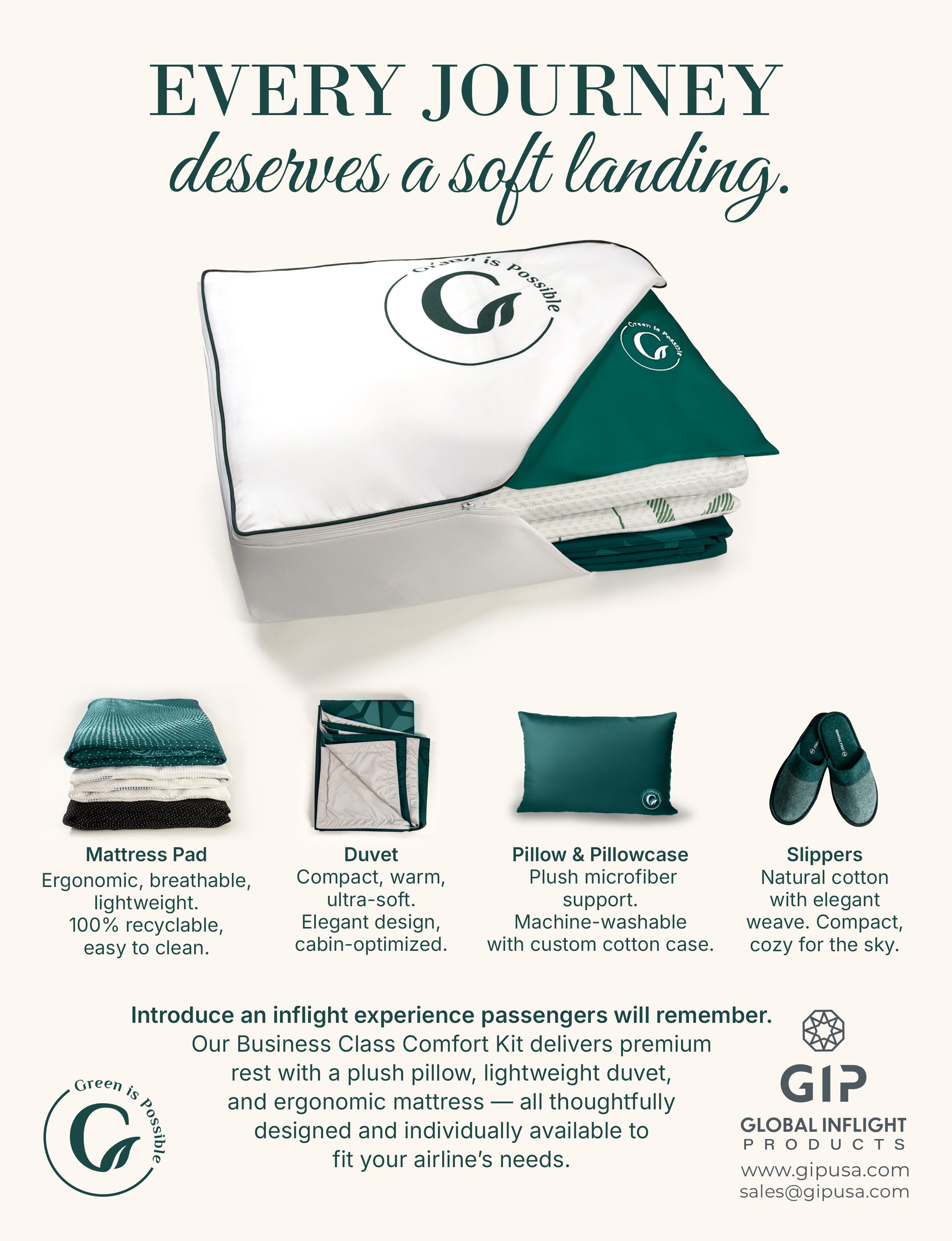 Global Inflight Products (GIP) showcased its suite of products at IFSA Global EXPO this fall, highlighting the customization options of its recently introduced compact duvet. The temperature-sensitive duvet offers airlines the ability to select colors and patterns on each side, opening new opportunities for brand expression in the cabin. Despite its reduced size when folded, half the volume of GIP’s standard duvets, the product unfolds into a generously sized blanket that delivers the warmth and comfort passengers expect.