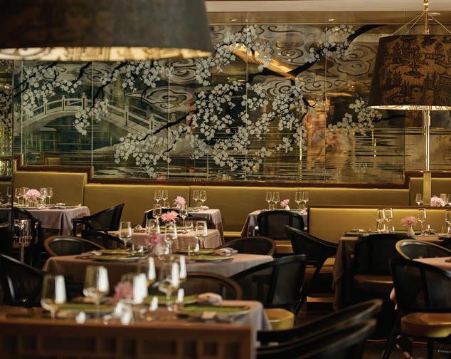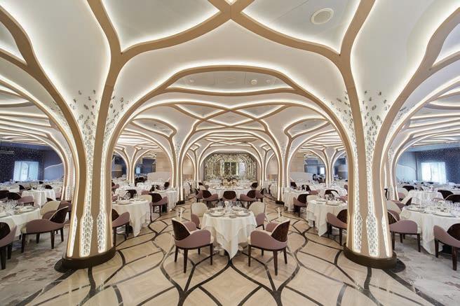 Anchoring it all is Journey in Jewels, a one-of-akind Fabergé egg created exclusively for Seven Seas Grandeur and the first Fabergé egg ever to live permanently at sea. Its seven sculpted blue blades unfurl like waves, a subtle homage to the ocean below.