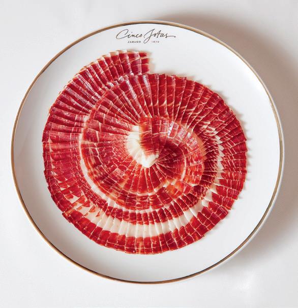 Dafür braucht es eine ganze Reihe von Experten – von der Metzgerin über den Salzer bis hin zur Aufseherin des Reifungsraums, die mit Intuition entscheidet, wann der Cinco Jotas Schinken die perfekte Balance zwischen Salz und Feuchtigkeit erreicht hat. Erst dann wird das Fleischstück an den Meisterschnitzer überreicht, der mit scharfem Messer und grosser Erfahrung dafür sorgt, dass der handgeschnittene « 5J» in hauchdünnen und mundgerechten Scheiben sein volles Aroma entfalten kann.