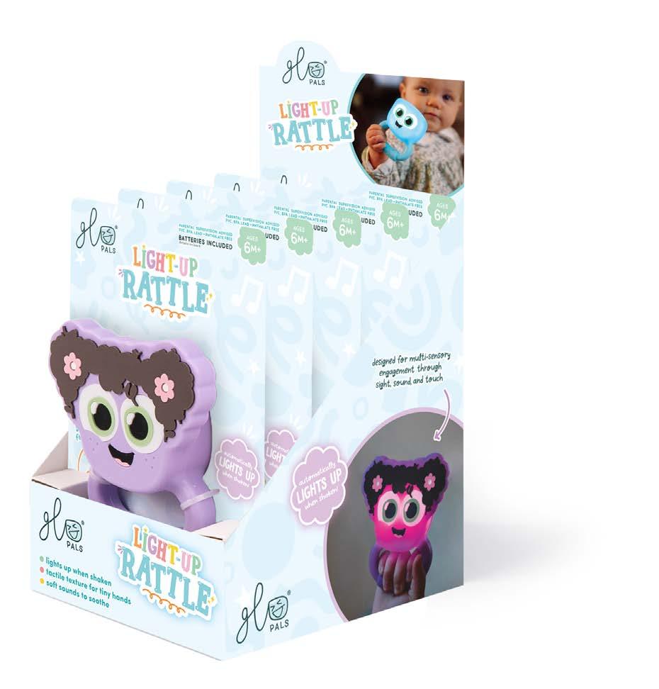 The Glo Pals Light-Up Rattle combines a gentle glow with soothing sound to engage your baby’s senses while encouraging motor skill development. The soft, easy-to-hold handle is perfect for tiny hands, and the light-up feature activates automatically when shaken.