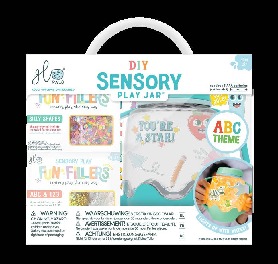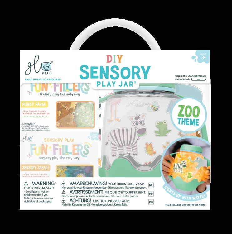 The DIY Play Jar Set includes: 1 Sensory Play Jar, 2 Packs of Fun Fillers and 3 Sheets of Peel + Play Sticker Clings