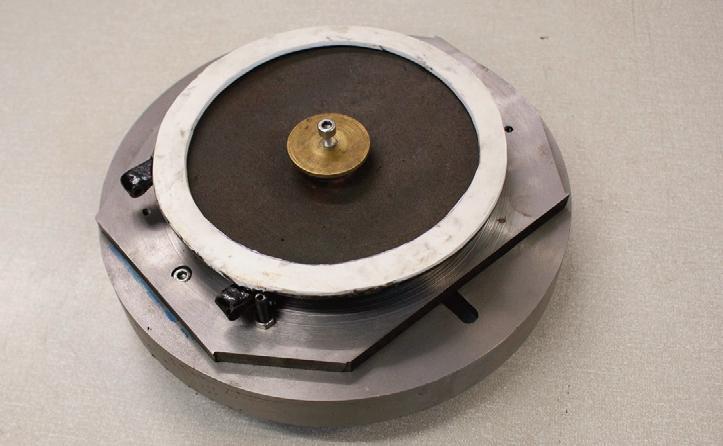 To resolve this Dave made a jig consisting of a round slice of mild steel bar the diameter of the door with a stud in the centre and three more equally spaced (120 degrees) on a radius around the central stud. Having drilled a hole in the middle of the door, it was then fastened down on the central stud with the convex side facing the jig