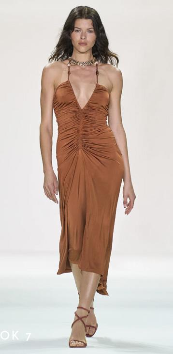 The past season’s focus on defining the waist continues. Weightless jersey bandeaus wrapped around long skirts and lean kneecropped pants. Molded tunics are tailored with gentle curves, a foil to fluttering bias-cut lace, chiffon and lamé skirts.