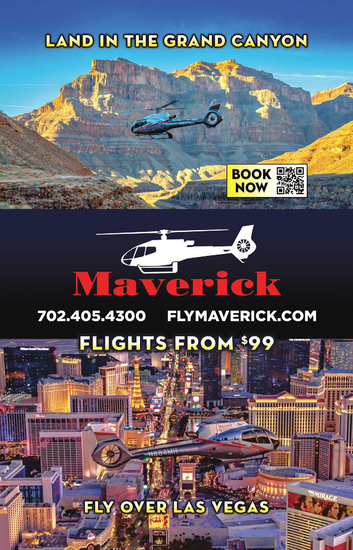 Maverick Helicopters Enjoy VIP excursions to the Grand Canyon and over the Strip. Fly in a state of-theart helicopter and enjoy narration by your pilot. 6075 Las Vegas Blvd. S. 702.261.0007 or 866.644.8687