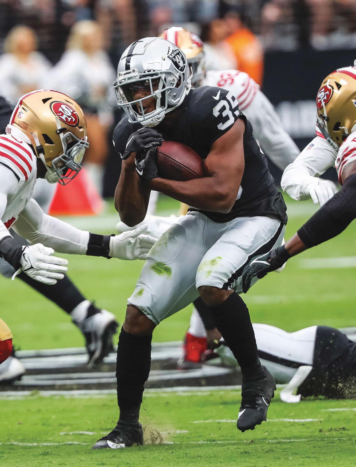 Raiders running back Zamir White (35) runs the ball during an NFL preseason game against San Francisco. (Wade Vandervort/Staff)