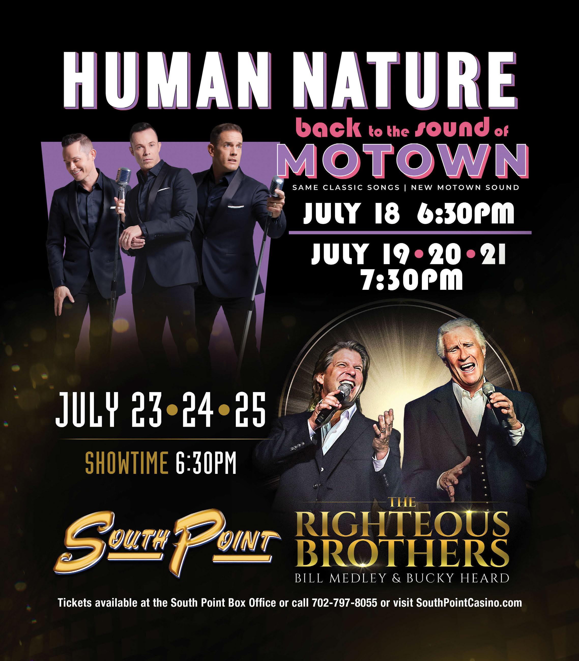 HUMAN NATURE 6:30 p.m. (& 7/1921, 7:30 p.m.), South Point Showroom, ticketmaster.com