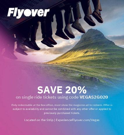 FlyOver Las Vegas Suspended above a 52 1/2-footwide screen, riders experience the sensation of buzzing over some of the world’s most breathtaking views without leaving the Strip. 3771 Las Vegas Blvd. S. 866.498.2023 or flyoverlasvegas.com