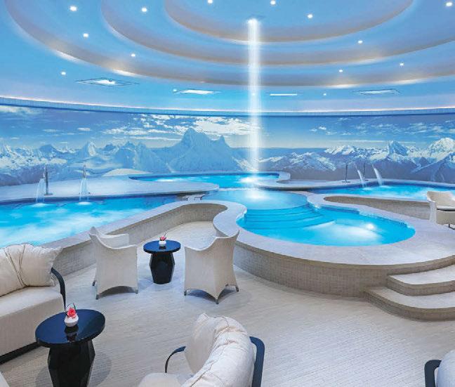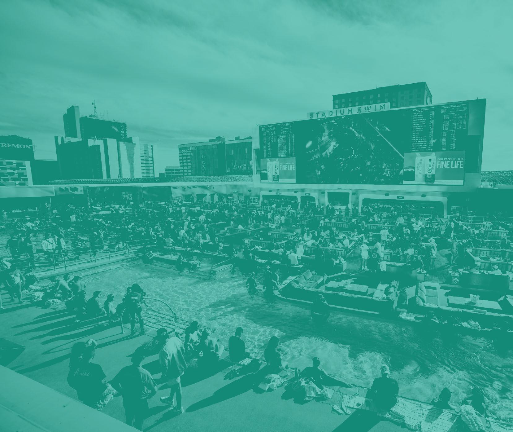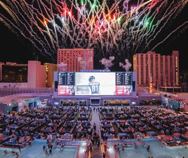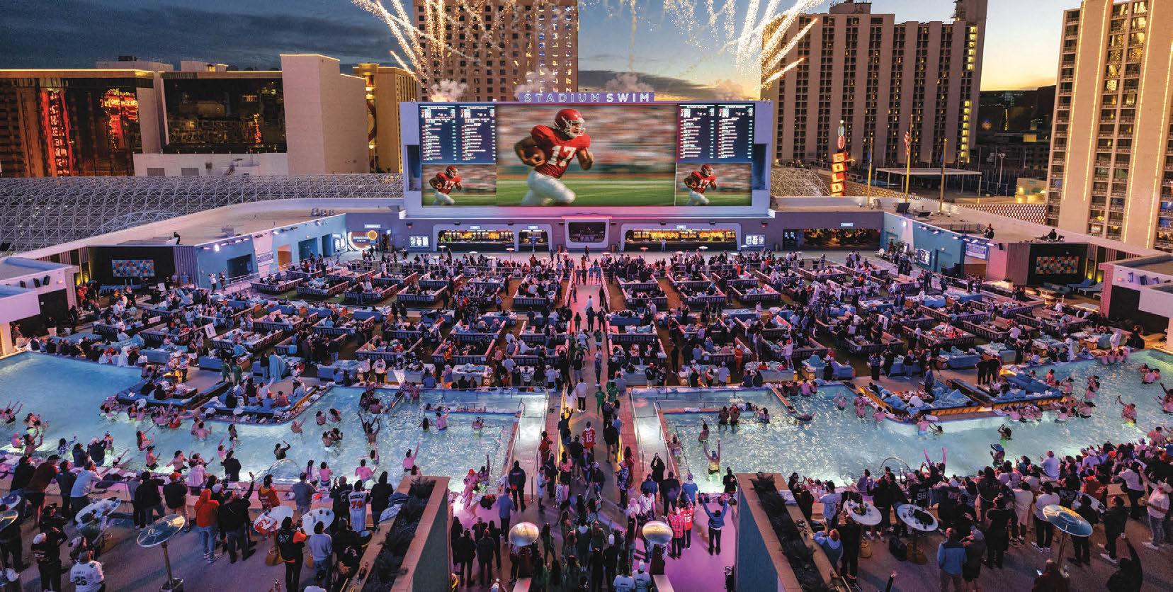 Dive into the Big Game at Stadium Swim, with its high-resolution, 143-foot diagonal, 14-million-pixel screen, six temperaturecontrolled pools and two hot tubs. Stadium Swim is hosting the ultimate viewing experience, complete with pyrotechnic displays and captivating visual effects.