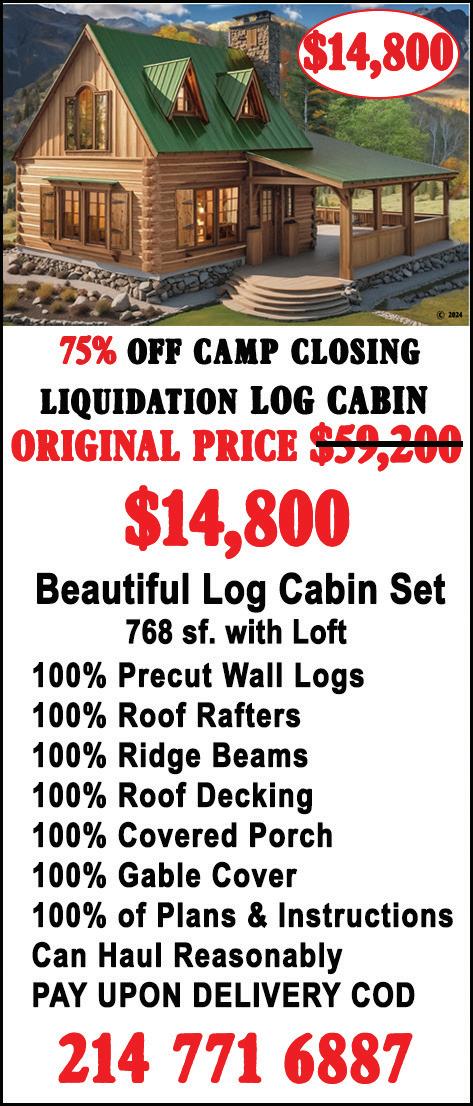 LOG HOME KITEASY ASSEMBLE. Fully Dovetailed, Pre - Cut Log Wall, Heavy Rafters- Beam Sized, Rustic - Look Roof Planking, Porch Columns & Cover, DIY Super - Fast Assembly! Pay When Delivered! Call to Get Details & Photos, 214-771-6887.