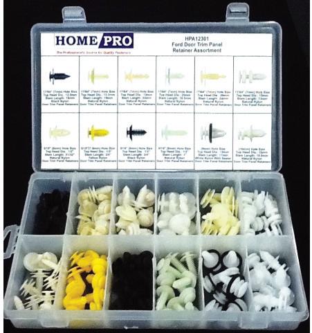 Ford door trim panel retainer assortment for cars & trucks. Includes 116 retainers, 12 styles, In 12 compartment, locking poly container, Clearly labelled. FREE SHIPPING in the USA. Mention Pigeon Forge Rod Run when you order! www.HomeProFasteners.com