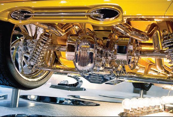Tammy Ray’s rolling work of art features an LS2 Chevy dressed to the nines with a TH350 transmission to match. As you can imagine, most of the bits under the hood are handmade, such as the brass radiator, headers, exhaust system, valve covers (each one featuring a one-ounce gold nugget!) as well as the unique intake tract. Featuring a custom intake manifold with a fuel injection system from Extrudabody, the painted runners with chrome plated tips with mesh inside really create a different look. The air-intake tubes were fashioned to resemble an exotic, long-runner injection system from days gone by. Meziere supplied the electric water pump.