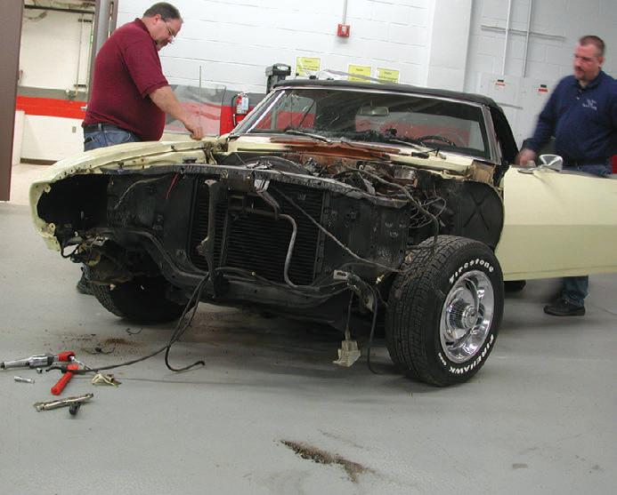 The idea of the car came to life in 2005, to create two training aids: a fully restored vehicle and a modified vehicle. The restored side in yellow was built back to its factory specifications, with a few minor modifications used as teaching points. The modified side in red represents what a person might build in their garage at home, with inexact repairs and plans to drive and enjoy the car.