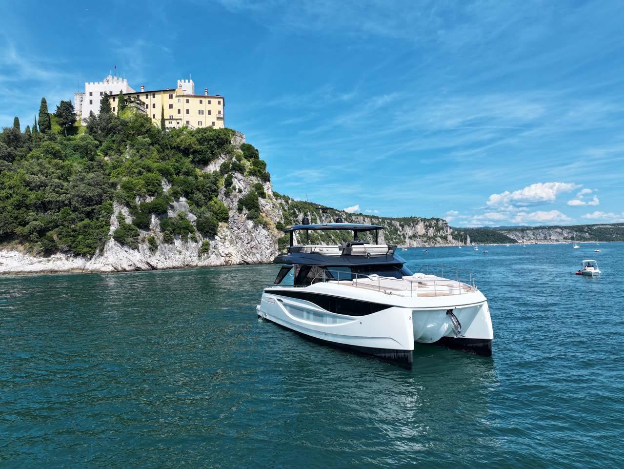 Mais revenons un tout petit peu en arrière : en 2022, Prestige présente sa M48, son premier catamaran à moteur. Après trente-trois ans de production exclusivement monocoque, on peut se douter que la démarche marketing a été très mûrement réfléchie. Partant du principe que les clients de la marque demandaient toujours plus de confort et d’aisance, et que cette exigence arrivait à son maximum en matière de faisabilité avec la dernière gamme X-Line, les équipes de Prestige Yachts ont décidé, en accord avec le groupe Beneteau, de se lancer sur le marché des powercats. Pas question pour autant de « perdre » les clients fidèles de la marque ; il s’agissait avant tout de proposer une Prestige, mais avec deux coques, en amorçant une démarche écoresponsable. Une carène catamaran, Ã
