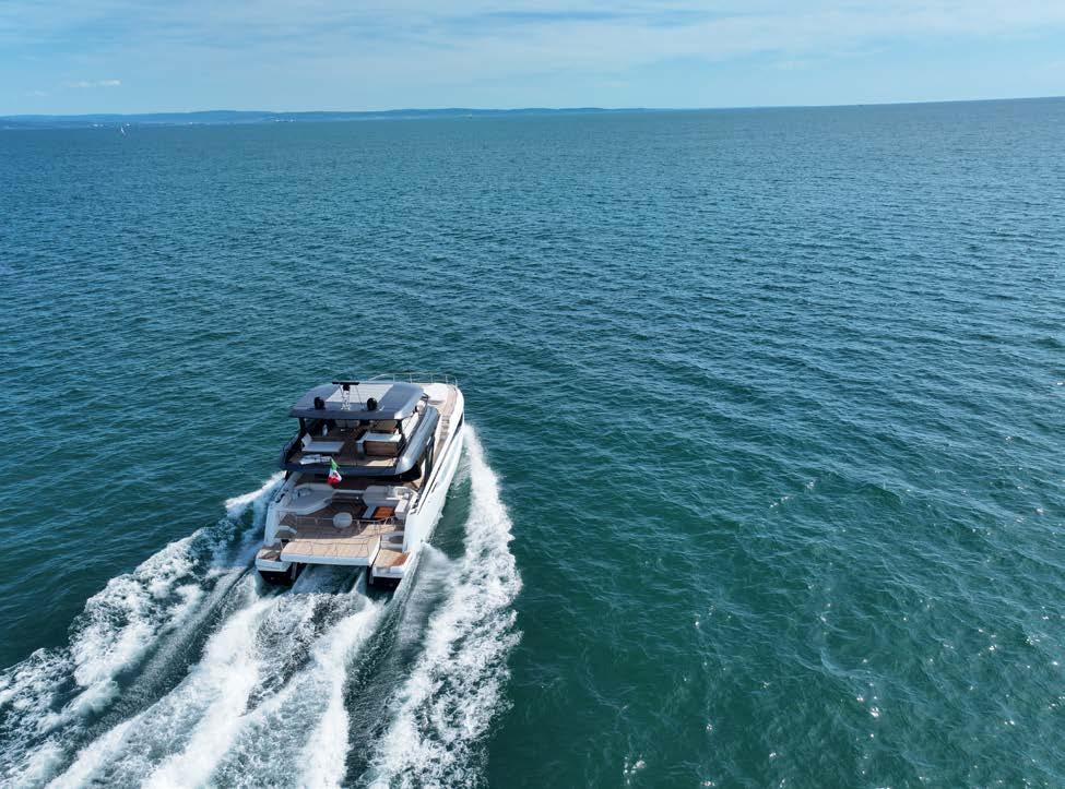 Cette nouveauté, qui s’intercale logiquement entre la M48 et la M8, a été annoncée lors du boot Düsseldorf, en janvier 2025. Six mois plus tard, le constructeur nous a dévoilé ce troisième modèle de la gamme M en avant-première à Monfalcone, en Italie, à quelques encâblures du chantier où il a été construit.