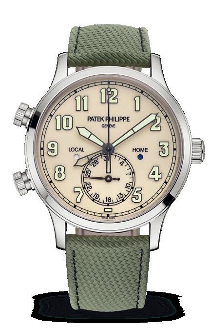 Patek Philippe bereichert die Linie Calatrava Pilot mit einer neuen Version der Referenz 5524G im 42-mm-Weißgoldgehäuse, kombiniert mit einem elfenbeinfarbenen Zifferblatt, das einen reizvollen Kontrast zu den applizierten Ziffern aus geschwärztem Weißgold und den nachleuchtenden Schwertzeigern bildet. Der Zeitmesser steht in der großen Tradition der Fliegeruhren und betont seinen professionellen Charakter, bewahrt sich jedoch seine besondere Eignung für Fernreisen dank der Anzeige einer zweiten Zeitzone und einem auf die Ortszeit indexierten Datum. patek.com