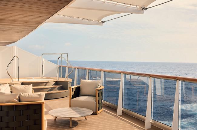 Ocean Penthouses (bis zu 68 m²), Ocean Residences (bis zu 149 m²) und die spektakuläre Owner’s Residence mit 280 m². Alle verfügen über einen großzügigen Ankleideraum, eine Sitzecke mit individuell ausgestatteter Minibar, eine individuelle Licht- und Temperaturregelung und sogar ein Fernglas, um den Ausblick auf den Horizont zu genießen. Das Wohlbefinden der Gäste ist ein wesentlicher Bestandteil des Erlebnisses mit Explora Journeys. Über 700 m² sind dem „Ocean Wellness – The Spa“ gewidmet, einem Ort der inneren Ruhe. Es gibt elf Wellnesskabinen, einen Bereich mit Hammam, Sauna, Salzgrotte und Erlebnisdusche sowie zwei VIP-Suiten mit privater Terrasse. Das 270 m² große Fitnesscenter bietet modernste Geräte, Pilates-Reformer, individuelles Coaching und Kursangebote im Innen- und Außenbereich. Auf den oberen Decks setzt sich das Wohlbefinden mit über 6000 m² Außenterrassen, einem überdachten Pool mit Glasdach, drei beheizten Außenpools, fünf Whirlpools und 64 privaten Cabanas, die ohne Aufpreis genutzt werden können, fort. Ein Fitnessbereich unter freiem Himmel mit Panoramablick auf das Meer rundet das Angebot ab.