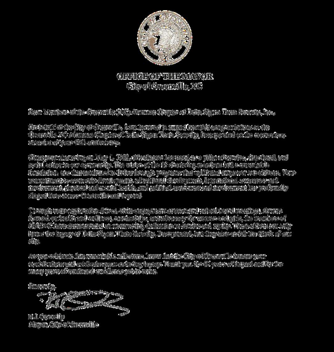 Good evening, Sorors of the Greenville (NC) Alumnae Chapter of Delta Sigma Theta Sorority, Inc., and distinguished Regional Director, Soror Pamela Murphy Lewis. First, let me thank my Sorors for the honor of being invited as a special guest to help celebrate your 60th Charterversary. Although I am unable to attend in person, I will certainly be with you in spirit.