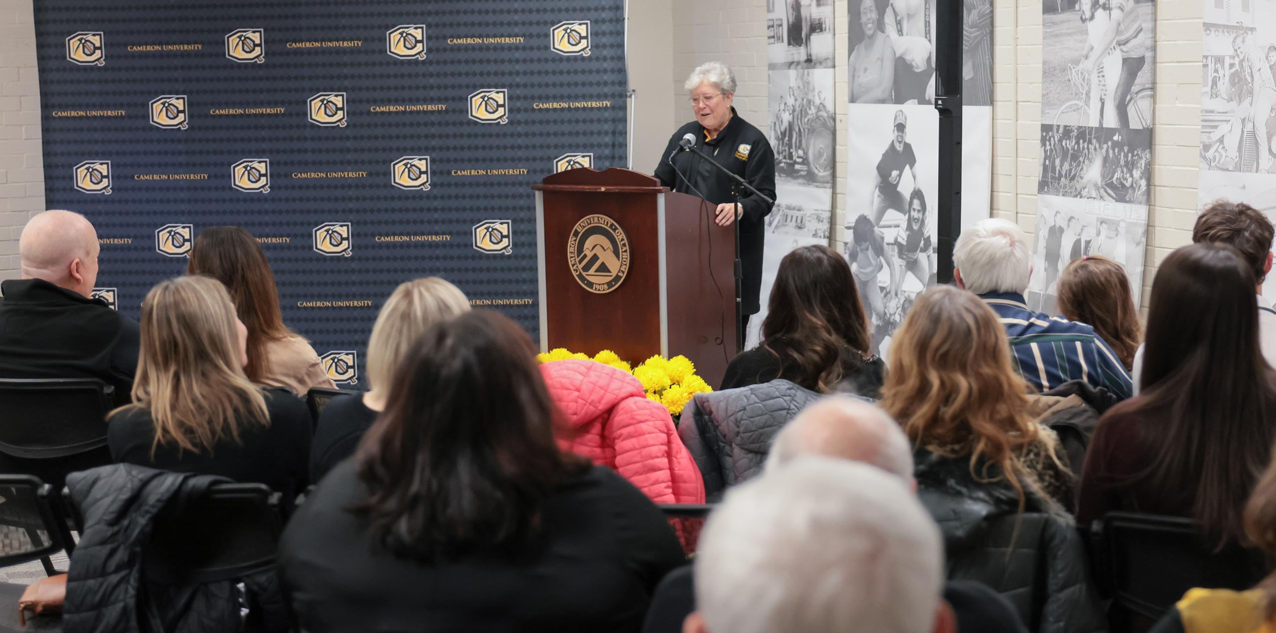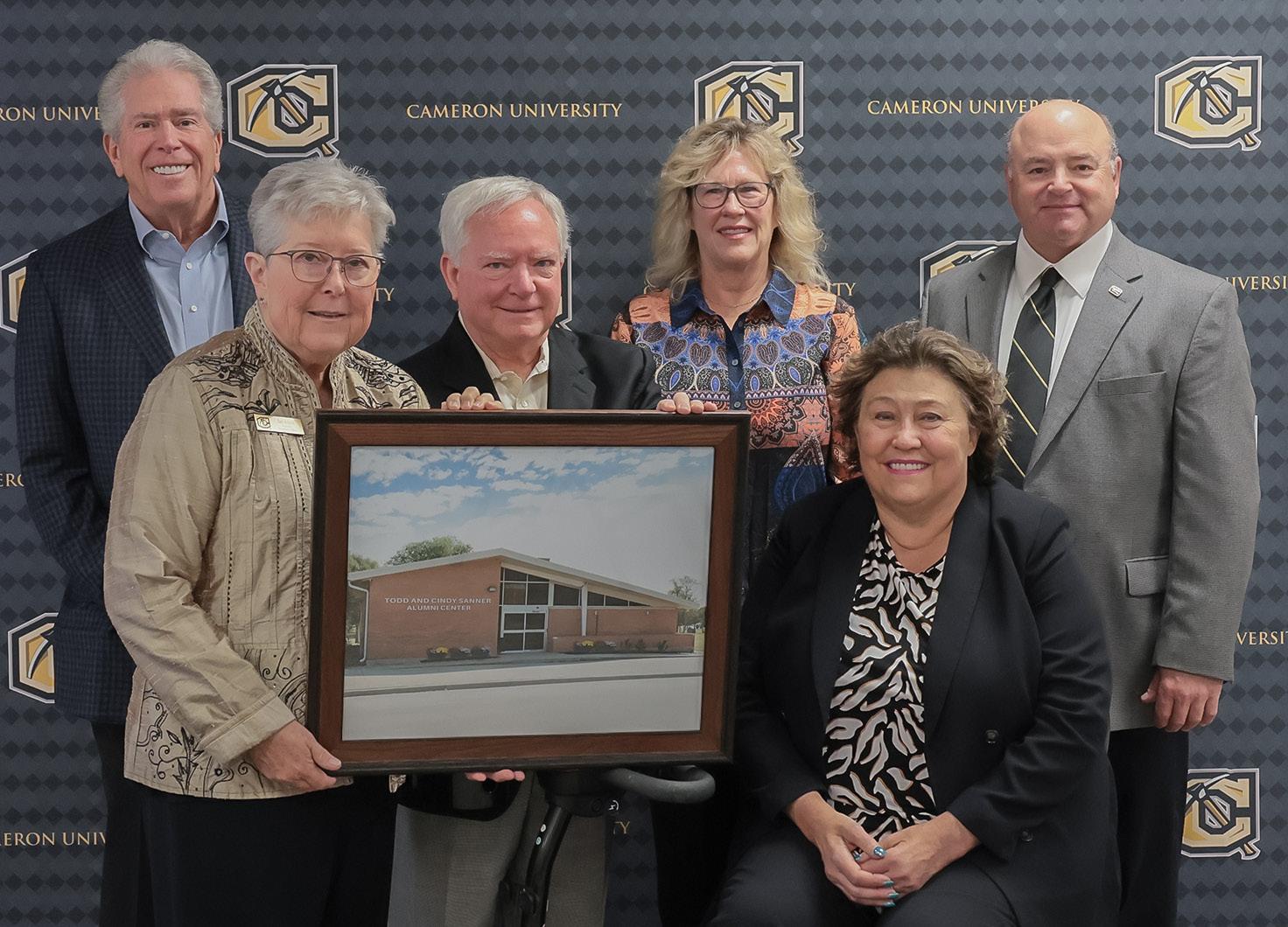 The gifts were acknowledged during an appreciation ceremony in early November. During that event, Barbara Braught, chair of the Cameron University Foundation Board of Directors, and Wayne Andrews, vice president of the Cameron University Alumni Association Board of Directors, joined CU President Jari Askins in expressing their gratitude for the donations made by the Sanners and Goeas. The ceremony was held in what is now the Sanner Alumni Center.