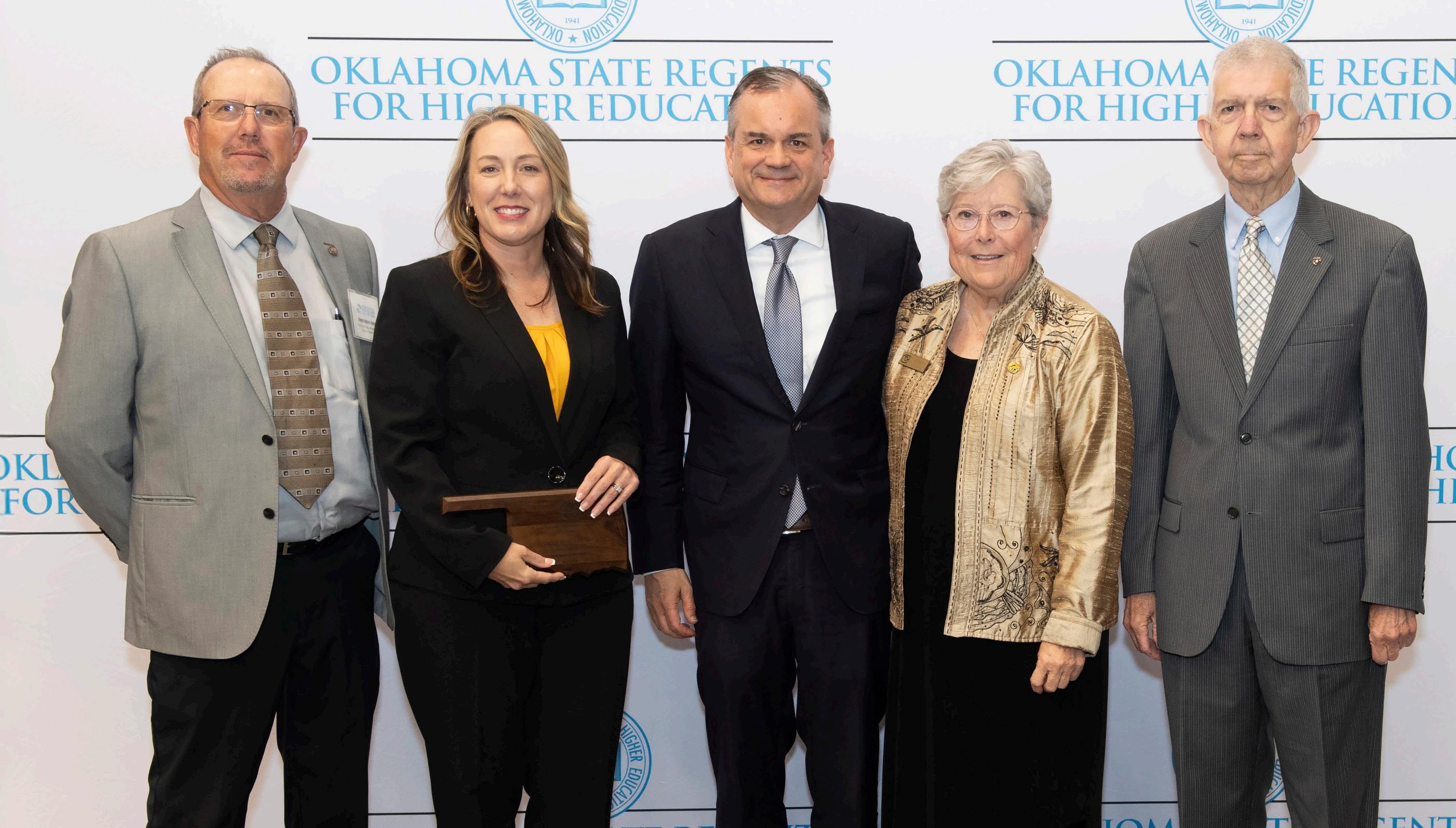 (left to right) Dennis Casey, former chair, OSRHE; Jennifer Meason, CEO Cotton Electric Cooperative; Chancellor Sean Burrage; then-CU Interim President Jari Askins; and Regent Stephen W. Taylor celebrate the partnership between Cotton Electric Cooperative and Cameron University.