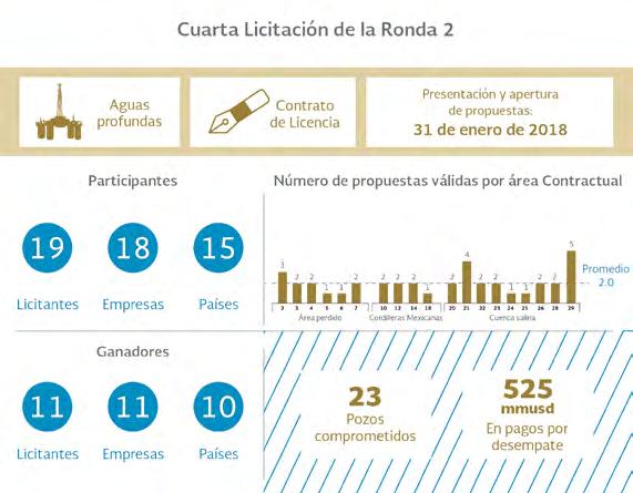 Hasta marzo de 2018, se han adjudicado 110 Contratos para la Exploración y Extracción de Hidrocarburos, de los cuales 71 ya se suscribieron, 36 se encuentran en proceso de firma, una migración de Pemex sin socio y dos migraciones de Pemex con socio; con una inversión acumulada de 536.95 millones de dólares a enero 2018, del monto señalado, 28.3 mmusd son aportados en proyectos localizados en Burgos, equivalentes a la construcción y equipamiento del edificio de Cardiología y Neumología del Hospital General de México9