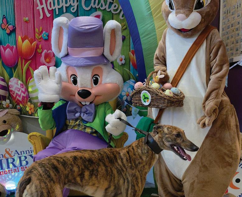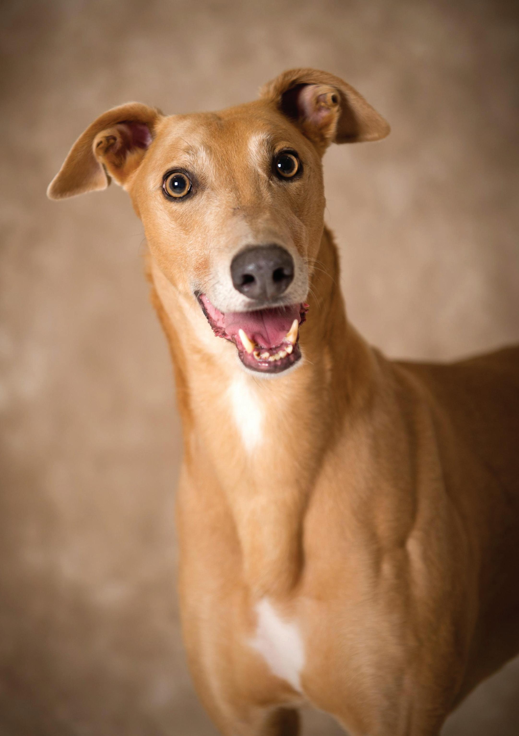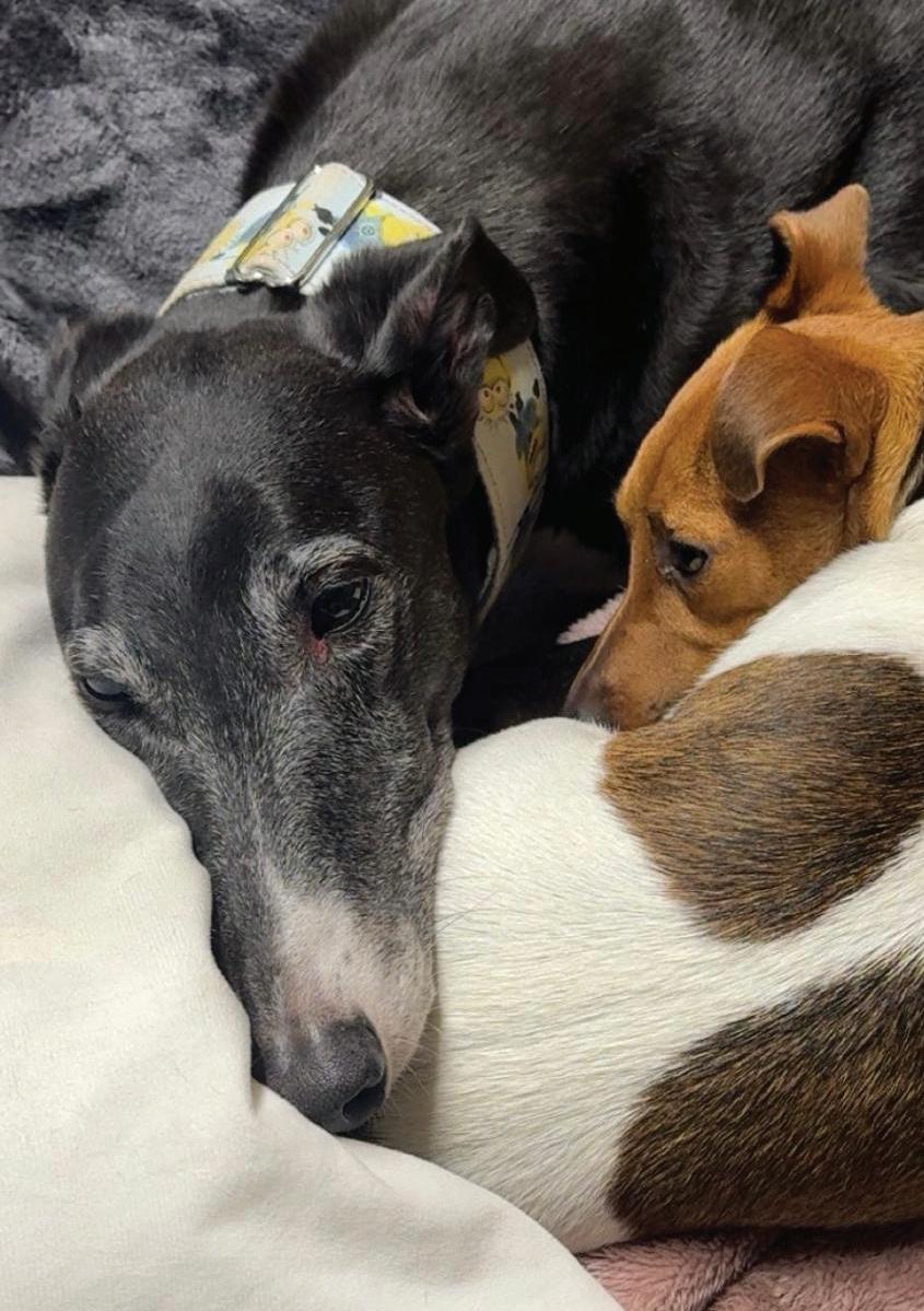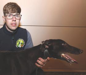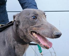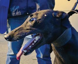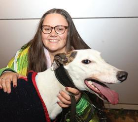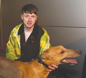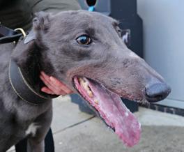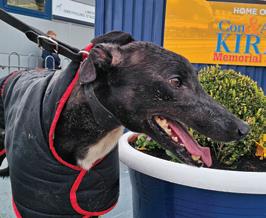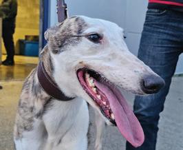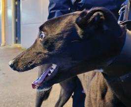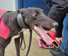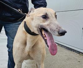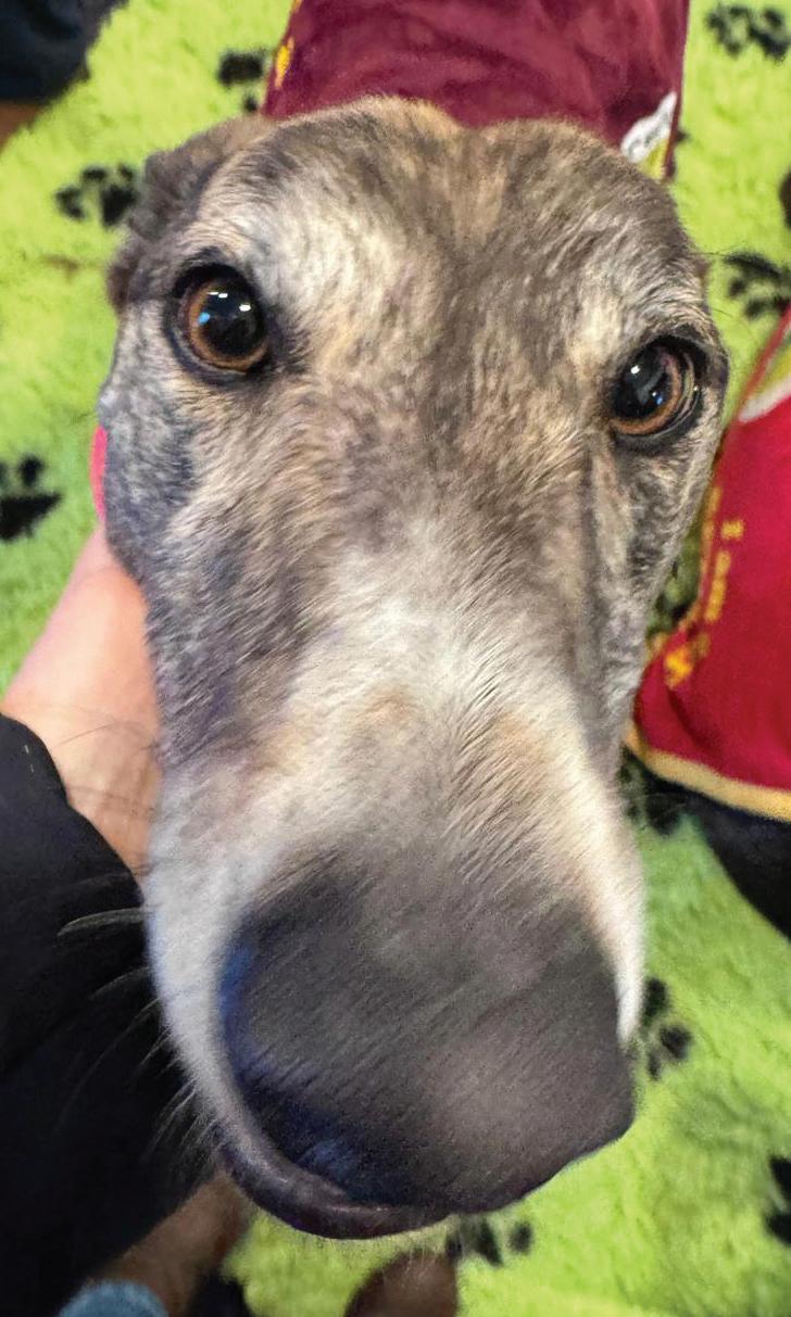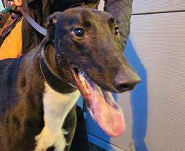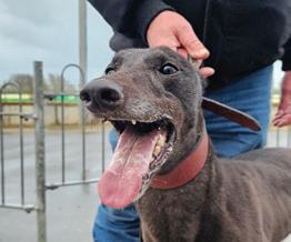 Previously known by the racing name RURAL VIC, he has been coming to Limerick Greyhound Stadium welcoming race goers since he retired in 2019. He’s quite the pro these days and loves meeting new people for ear rubs and any attention he can get! In his spare time he loves going for pup cups, going to the local nursing home a few times a week to interact with the residents (they keep their cookies for him!) and his favourite hobby is snoozing in front of the fire. Vic shares his home with another greyhound Alfie and 3 Jack Russells: Roxy, Abbie and newbie Max who all help small dog test the rest of the greyhounds at the care centre. A fun fact about Vic is that he is a regular blood donor at his local vets and has provided life saving blood to lots of doggies!
