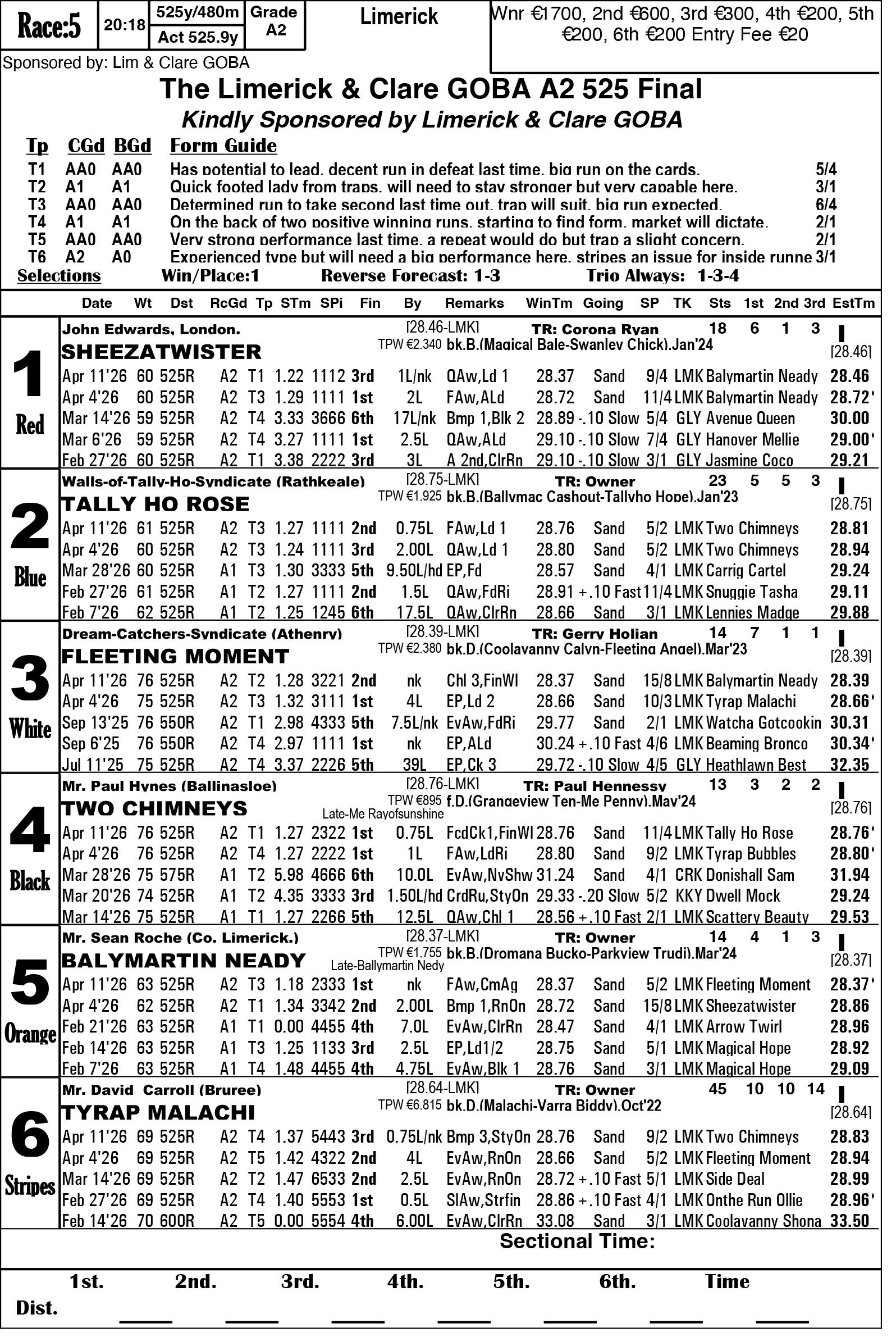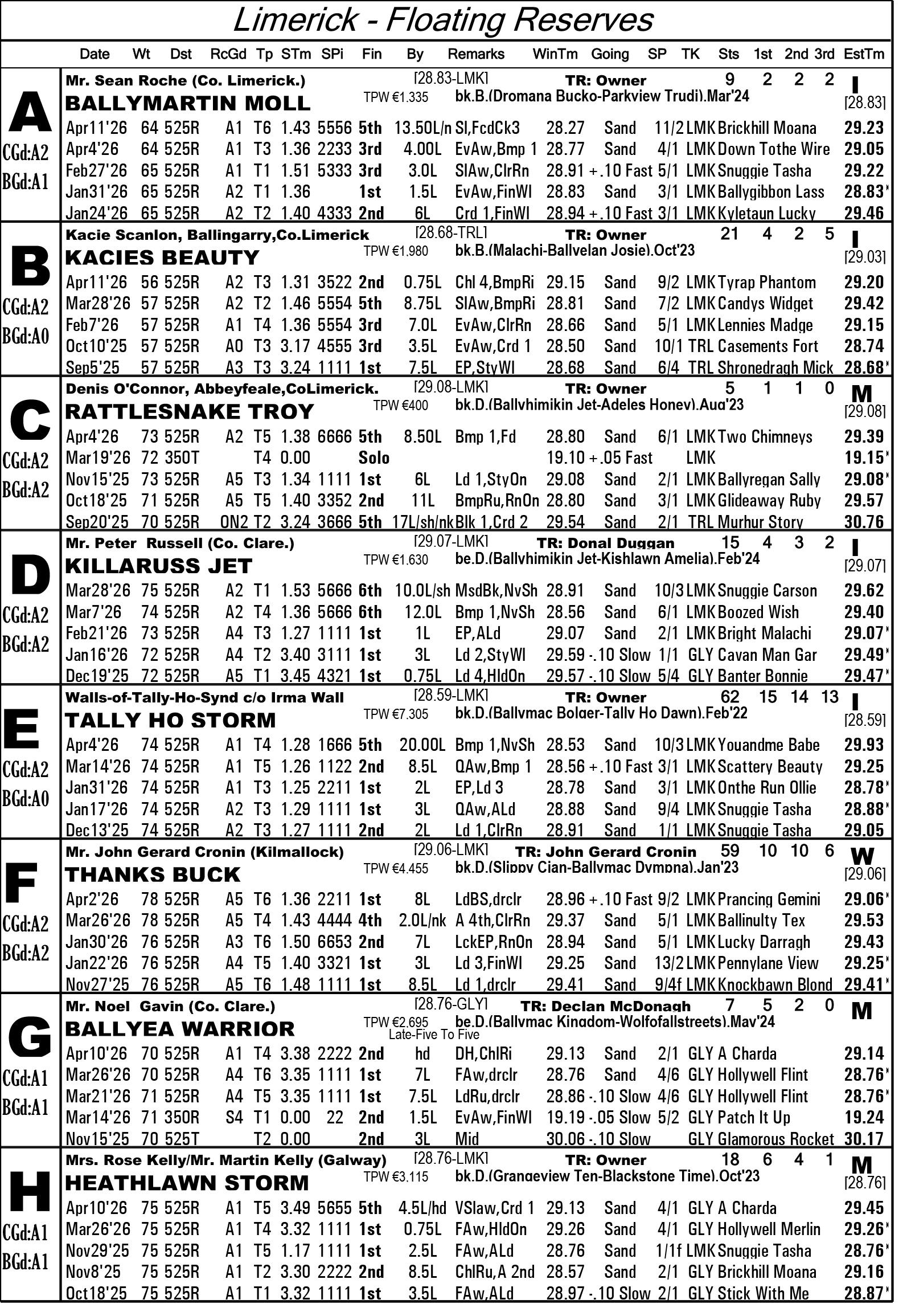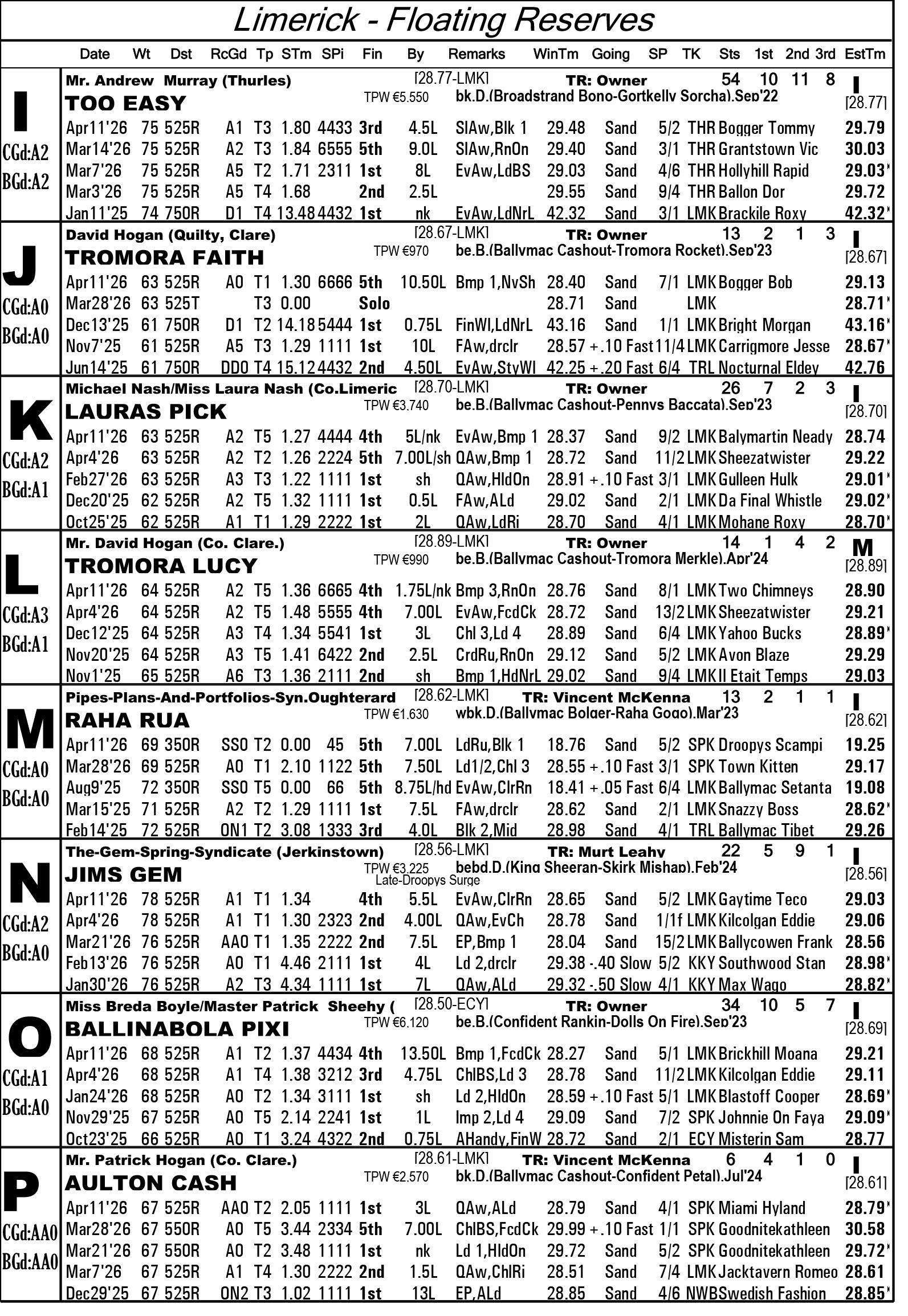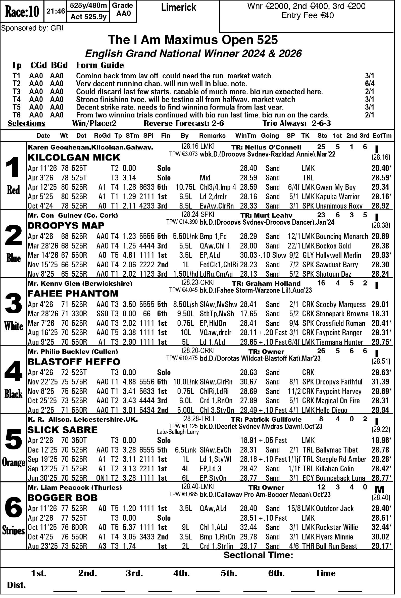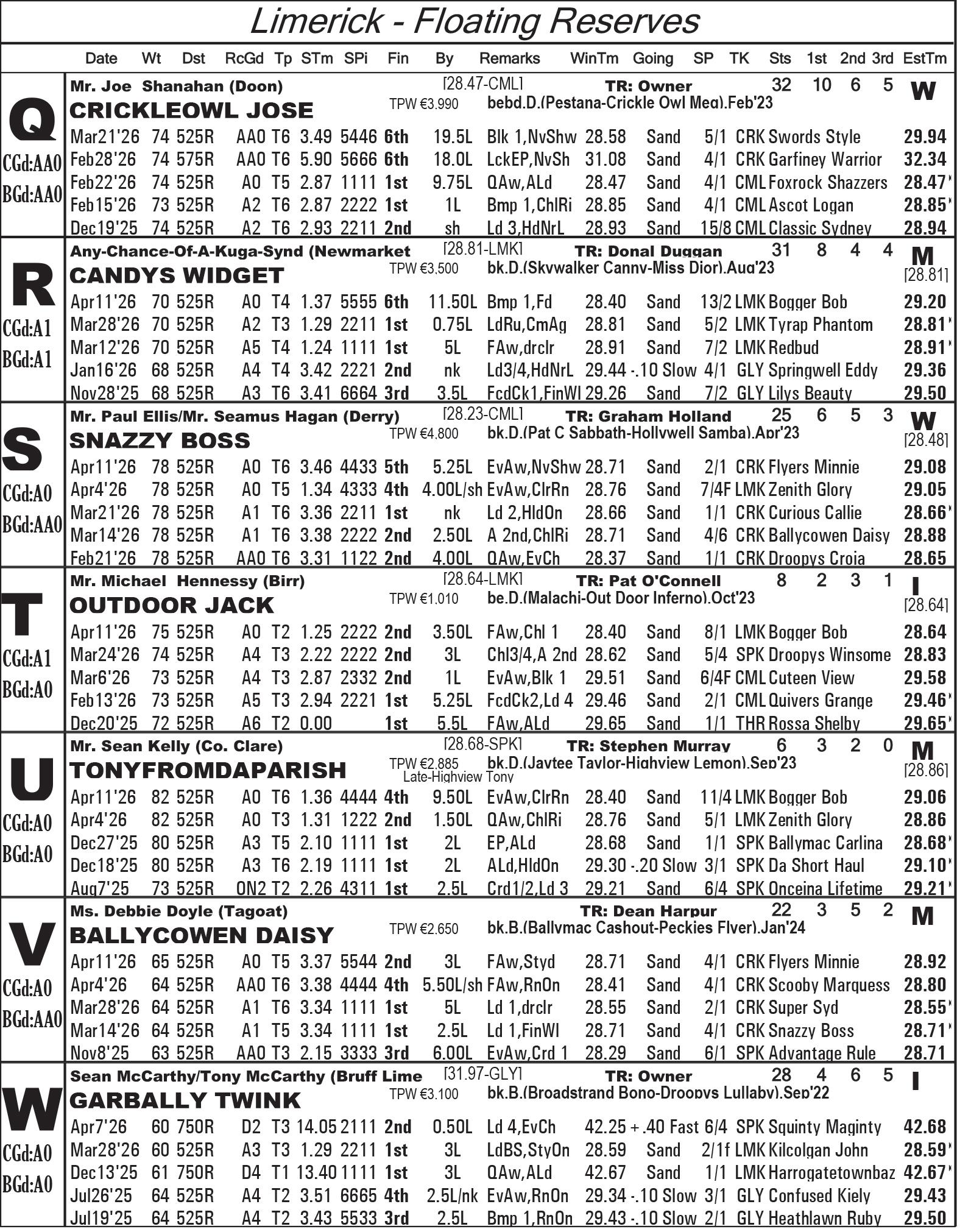 The Limerick & Clare GOBA would like to welcome all owners, trainers and visitors to racing this weekend. Hope you all have an enjoyable evening’s racing. We are in for a massive treat again this Saturday evening as we have reached the final stage of the 2026 Con & Annie Kirby. Congratulations to all who have qualified. This prestigious sweepstake for pups is the richest puppy sweep-stake in the world and is so kindly sponsored by Noreen & J.P. McManus. We all hope ye enjoy watching our best pups in the country and get to see the future champions in waiting. Congratulations also goes to the qualifiers of the Sean O’Connor A1 525 Memorial and Limerick & Clare GOBA A2 525 sweepstakes finals.
