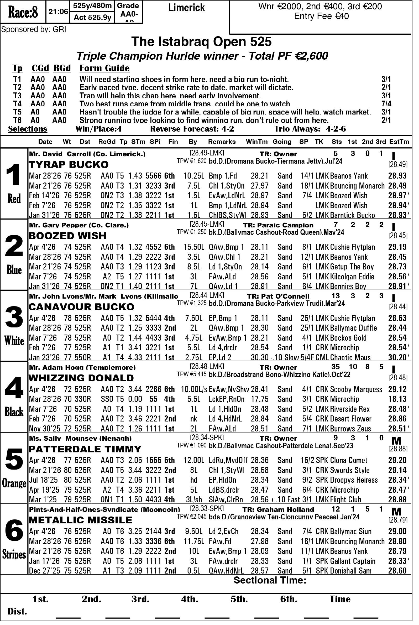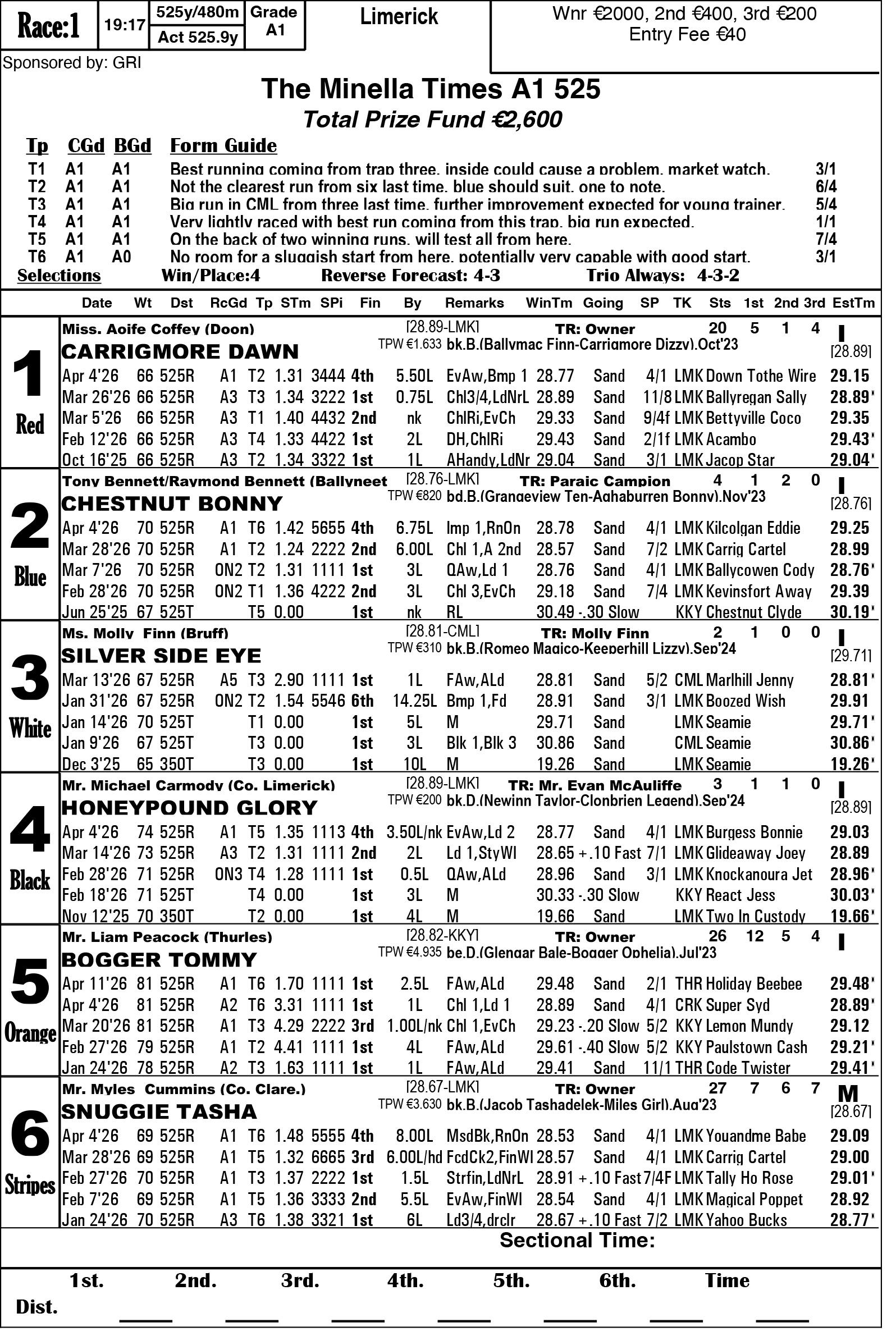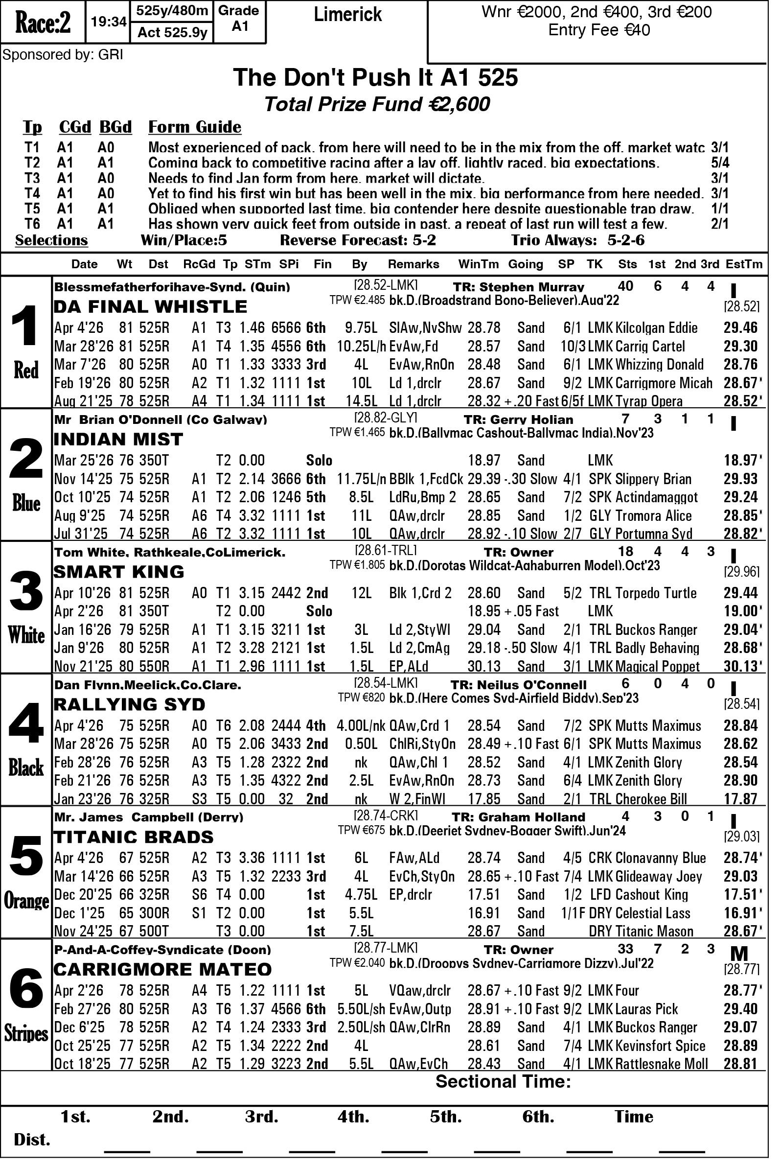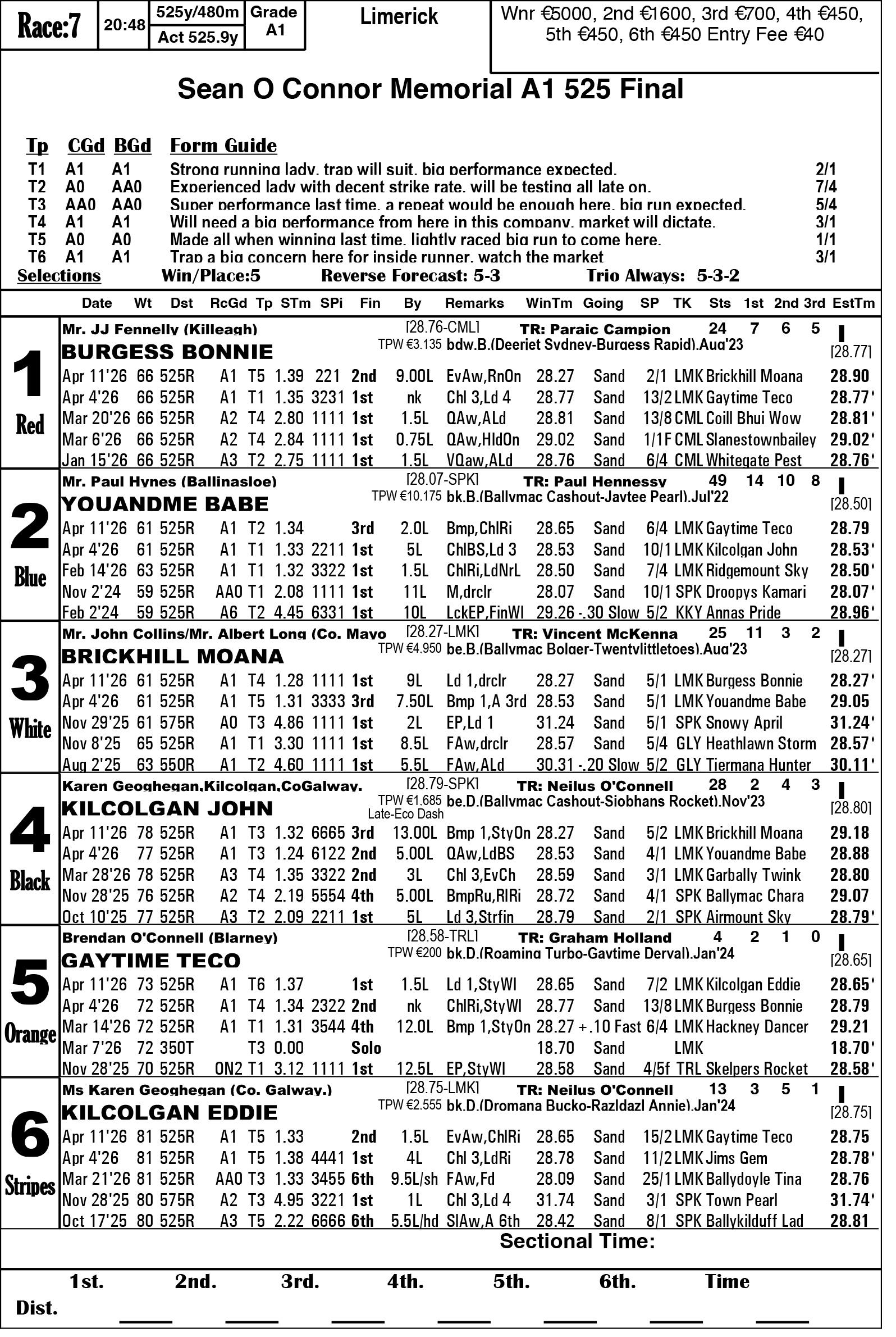 The Limerick & Clare GOBA would like to welcome all owners, trainers and visitors to racing this weekend. Hope you all have an enjoyable evening’s racing. We are in for a massive treat again this Saturday evening as we have reached the final stage of the 2026 Con & Annie Kirby. Congratulations to all who have qualified. This prestigious sweepstake for pups is the richest puppy sweep-stake in the world and is so kindly sponsored by Noreen & J.P. McManus. We all hope ye enjoy watching our best pups in the country and get to see the future champions in waiting. Congratulations also goes to the qualifiers of the Sean O’Connor A1 525 Memorial and Limerick & Clare GOBA A2 525 sweepstakes finals.