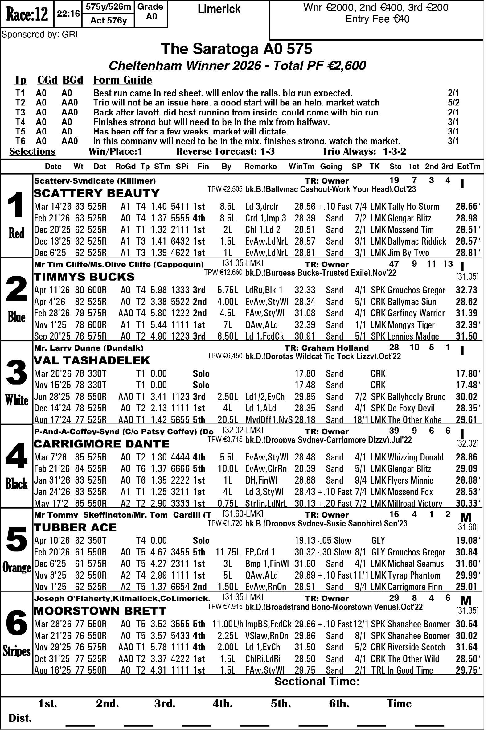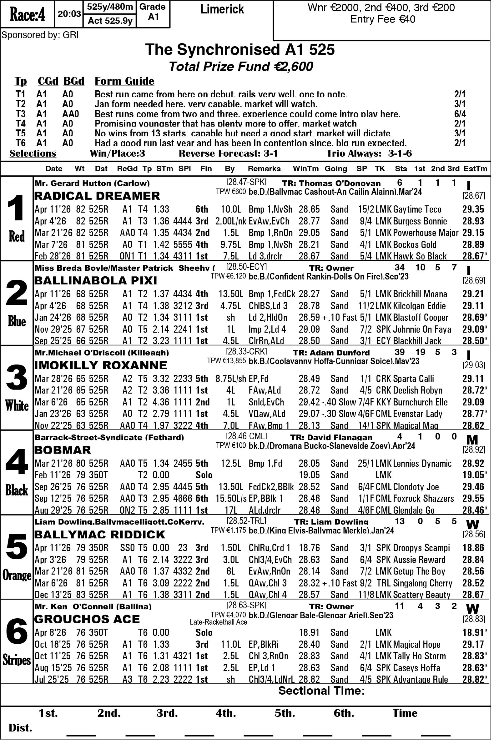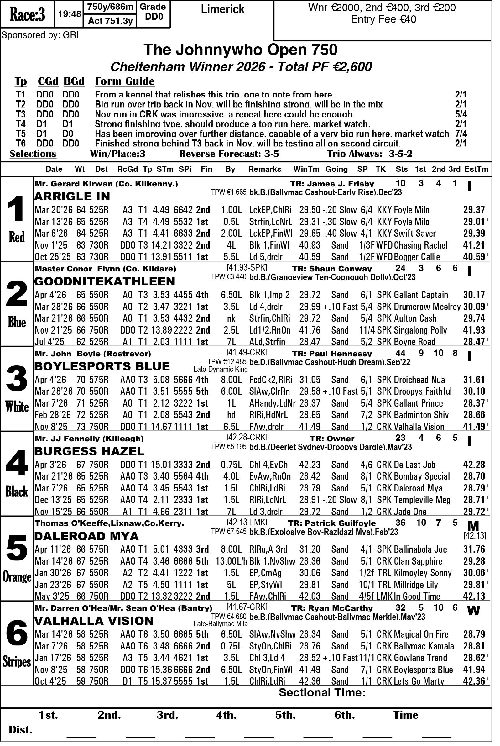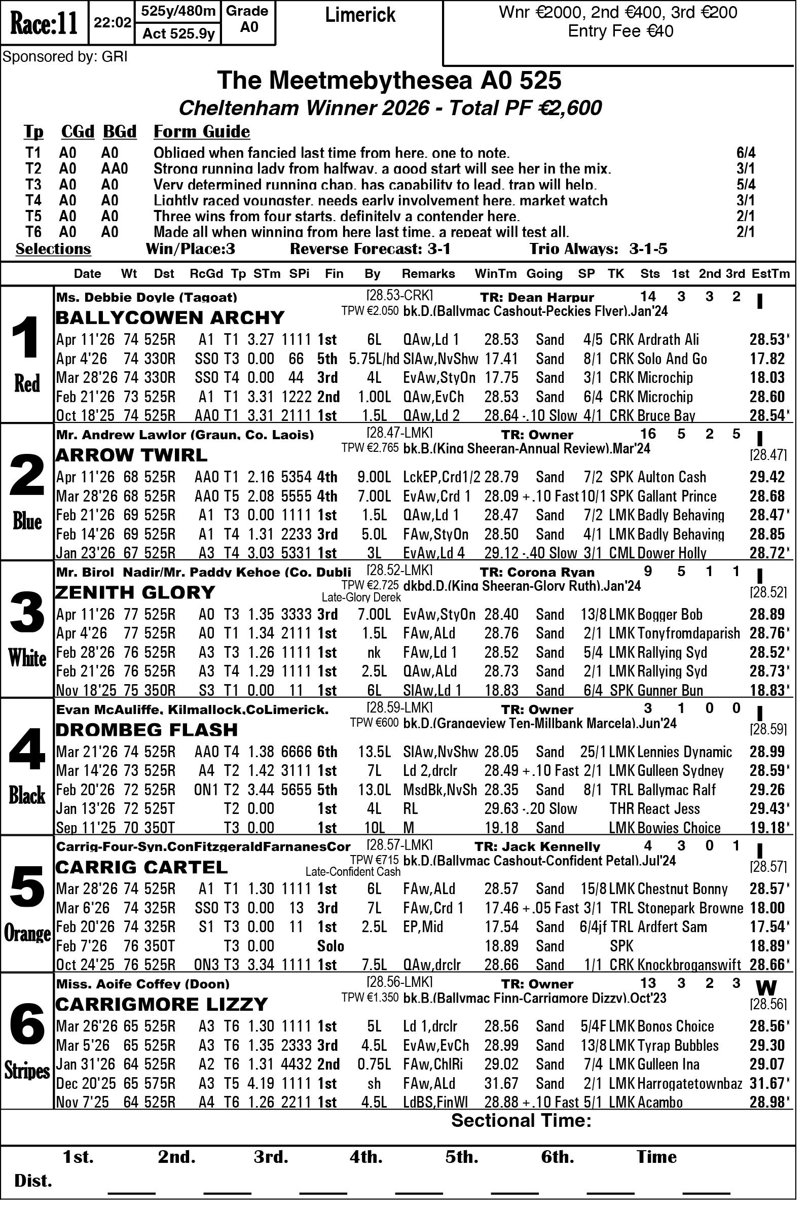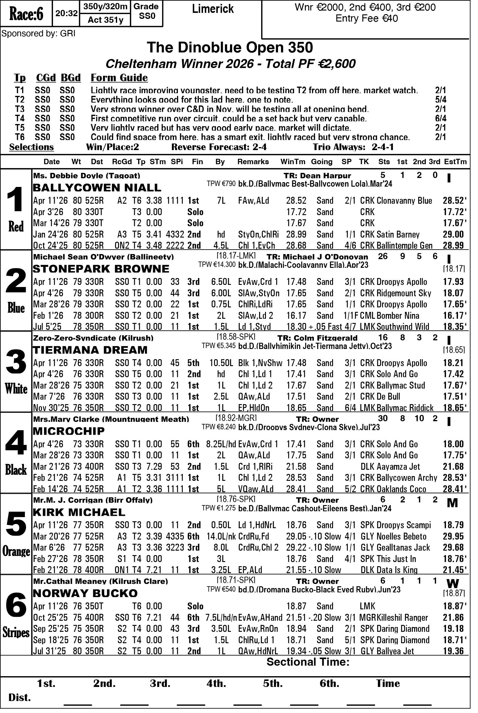 The Limerick & Clare GOBA would like to welcome all owners, trainers and visitors to racing this weekend. Hope you all have an enjoyable evening’s racing. We are in for a massive treat again this Saturday evening as we have reached the final stage of the 2026 Con & Annie Kirby. Congratulations to all who have qualified. This prestigious sweepstake for pups is the richest puppy sweep-stake in the world and is so kindly sponsored by Noreen & J.P. McManus. We all hope ye enjoy watching our best pups in the country and get to see the future champions in waiting. Congratulations also goes to the qualifiers of the Sean O’Connor A1 525 Memorial and Limerick & Clare GOBA A2 525 sweepstakes finals.